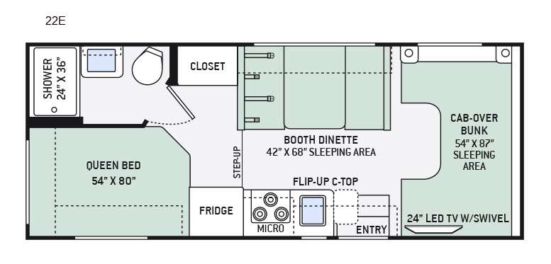 Enjoy each adventure in this Four Winds class C coach by Thor Motor Coach. Model 22E features a rear bath layout, and all the amenities you need to enjoy spending time on the road.