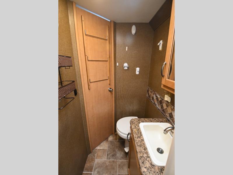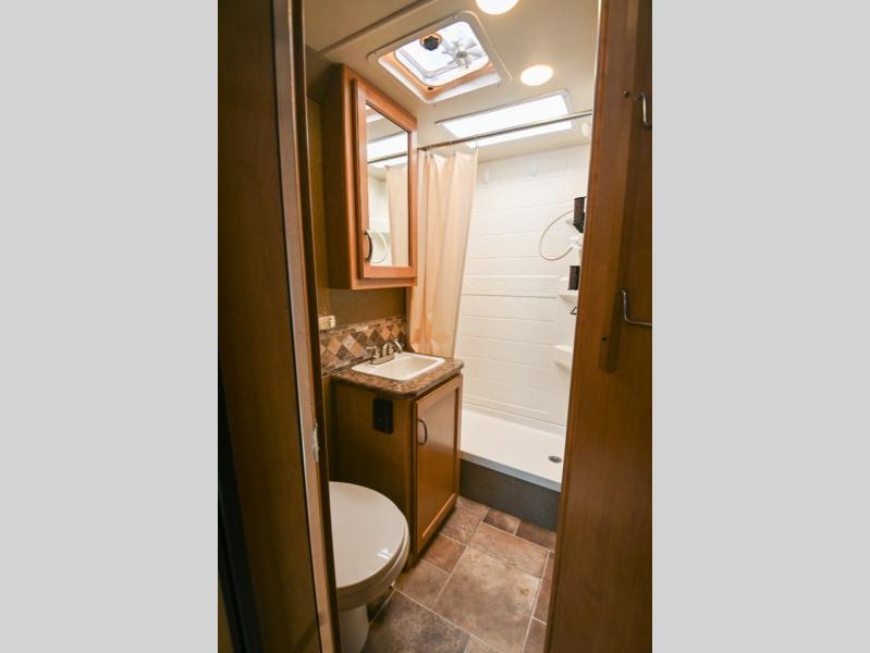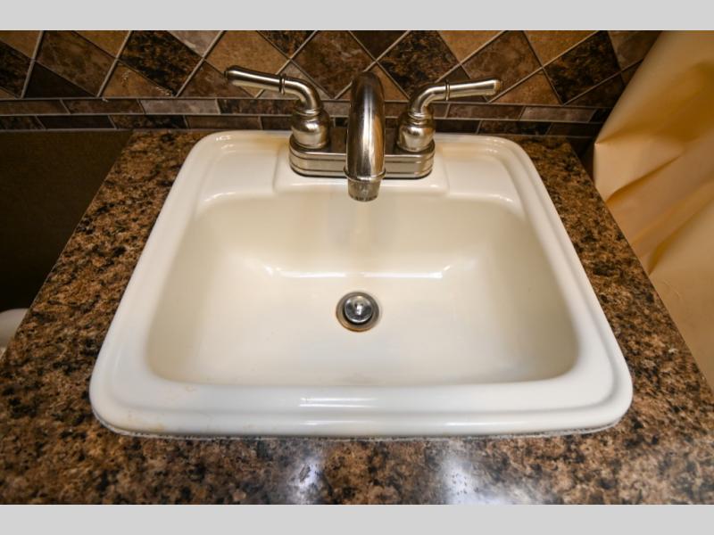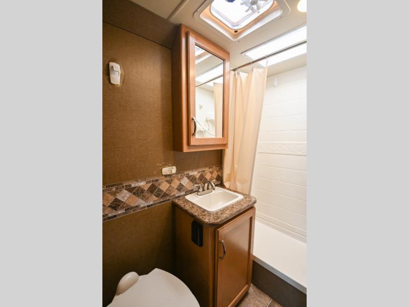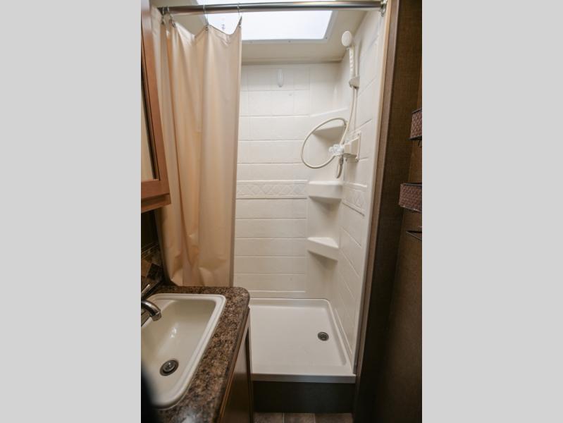 In the rear left corner is the bathroom. Here you will find a sink with a medicine cabinet, toilet, and a 24” x 36” shower.