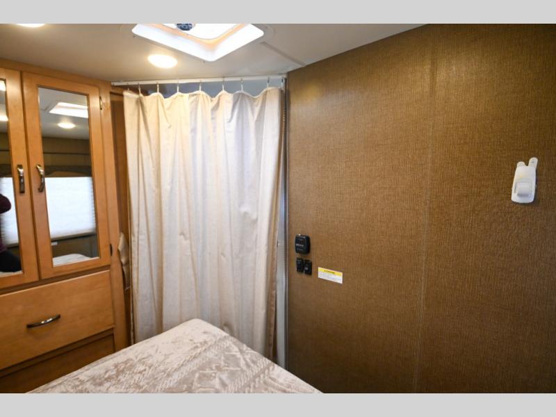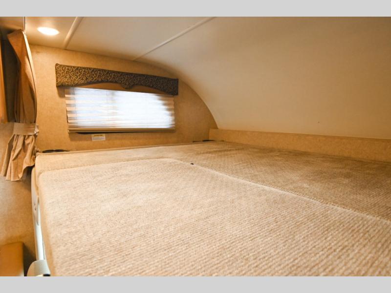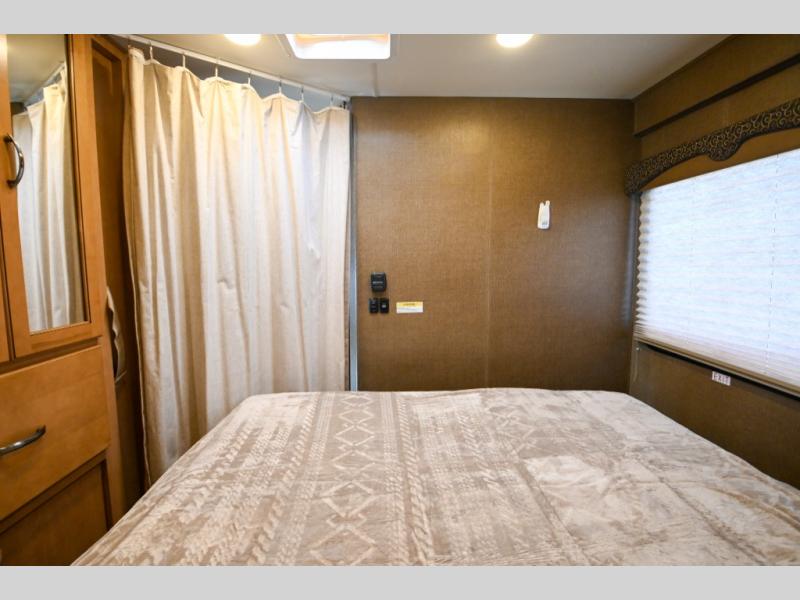 The opposite corner from the bathroom features the bedroom area with a privacy curtain. Here you will also find a slide out queen bed with an overhead cabinet plus there is a closet, and so much more!