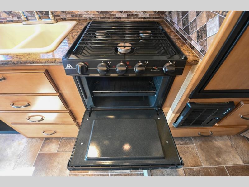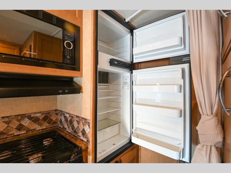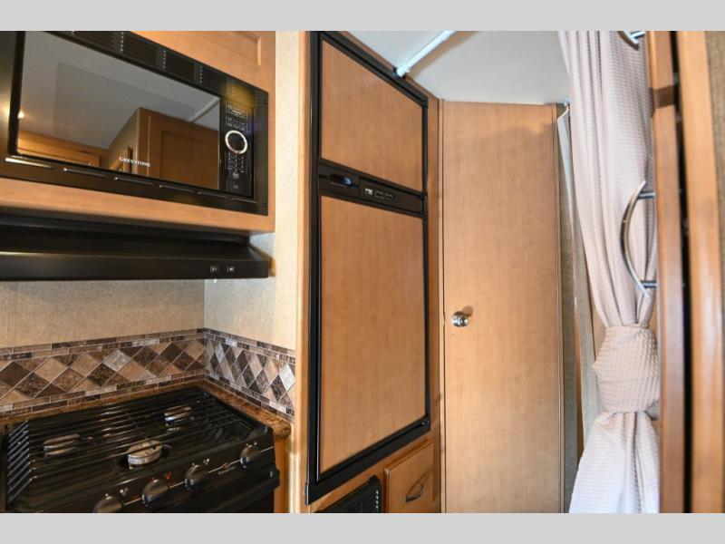 To the left of the door, you will find the kitchen amenities. Here there is a flip-up counter top, a large sink, overhead cabinets, a three burner range, an overhead microwave, and step up to the refrigerator. Across from the refrigerator, there is a pantry for your canned goods.