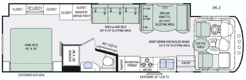 Step inside and see how convenient all of your traveling can be in this Miramar 34.2 model. The full wall driver's side slide provides you with an 46" x 85" dream dinette, 60" x 74" sofa with air bed, closet that has been prepped for a stackable washer and dryer, three additional closets, and a storage cabinet with a 32" LED TV above.
