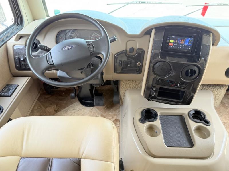 Moving toward the front of this motorhome, a side aisle full bathroom is on your left. It offers a 36" x 24" shower, extended vanity with sink, medicine cabinet, toilet, and overhead storage.
