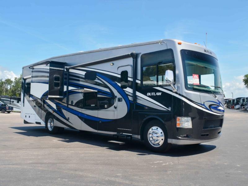 This Thor Motor Coach Outlaw Class A gas toy hauler makes it easy to enjoy your outdoor toys with all the comforts of home! Model 37RB features a 96" x 122" garage, a stair cased loft, plus complete kitchen and bath amenities!