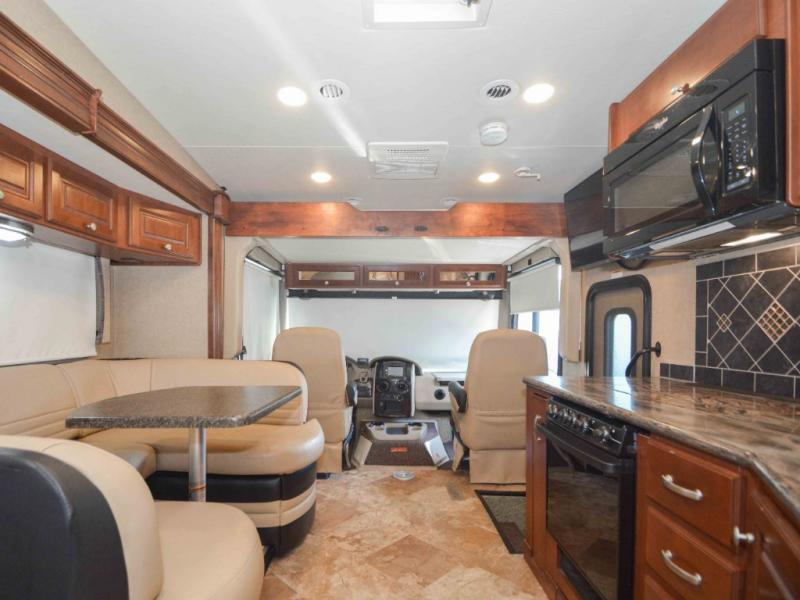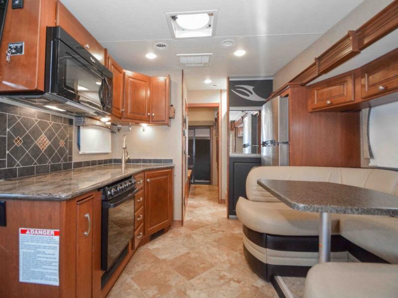 A combined kitchen and living greet you with a large u-shaped booth dinette and 54" x 74" drop down bunk and 32" LED TV for relaxing. The kitchen features a two door refrigerator, three burner range with a convenient pull-out spice rack next to it and an overhead microwave oven. A double bowl sink and plenty of storage space completes the kitchen amenities.