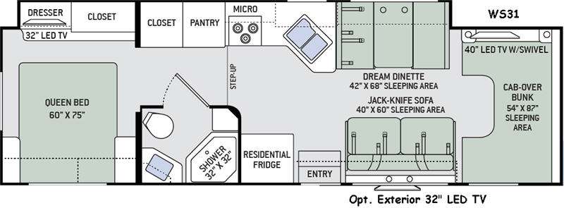 A full wall slide gives you the space you need when parked in this Thor Motor Coach Quantum class C model WS31.
