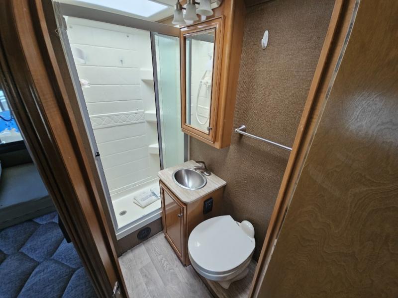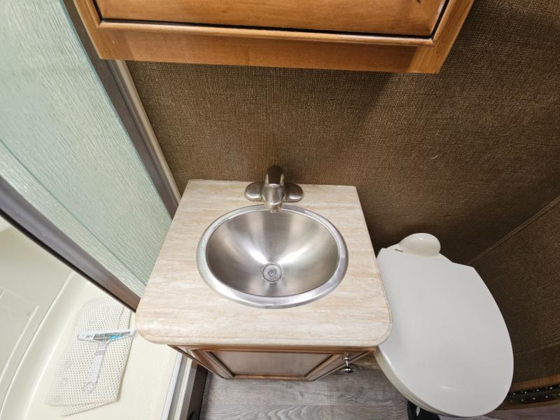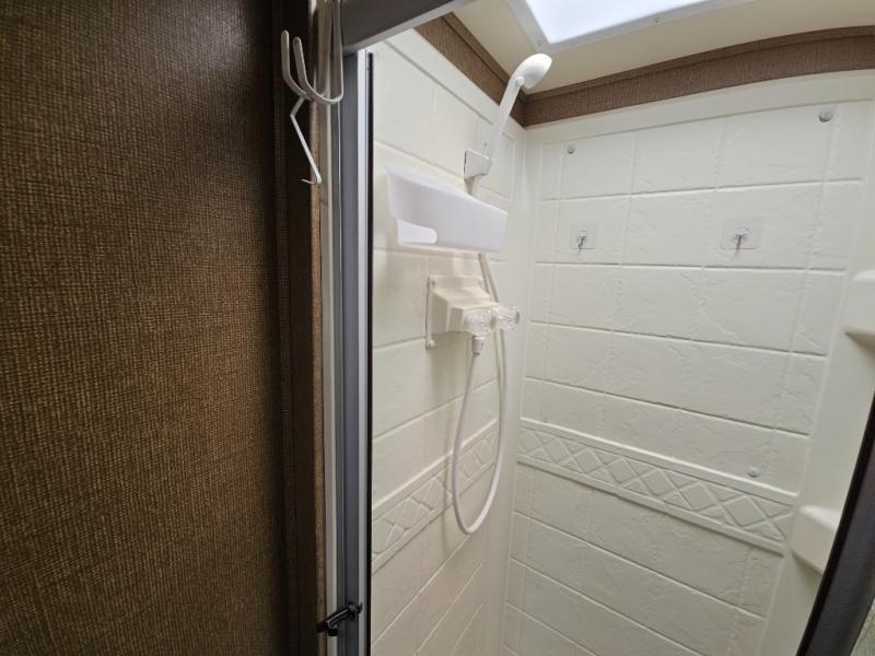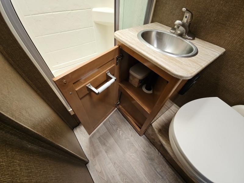In the rear of the Siesta Sprinter 24SA you will find a corner bathroom including a shower, vanity sink, medicine cabinet, and a toilet. There is a closet just outside the bath. The opposite rear corner holds a full size bed with overhead cabinets and optional 24" LED TV.