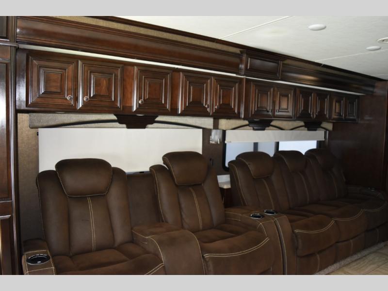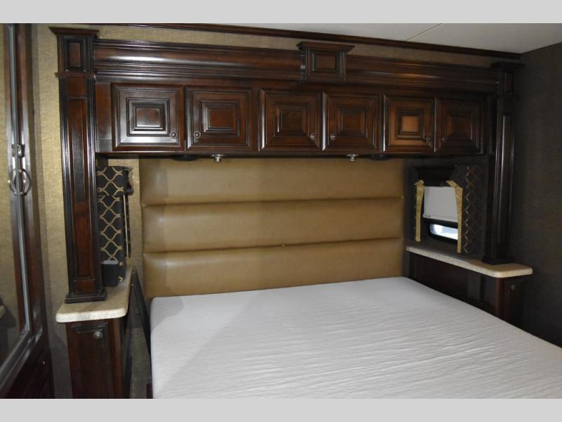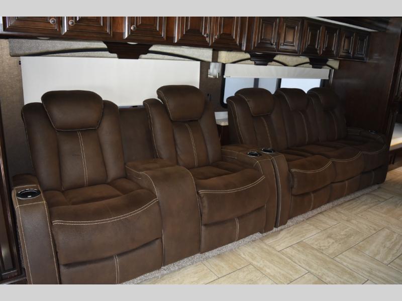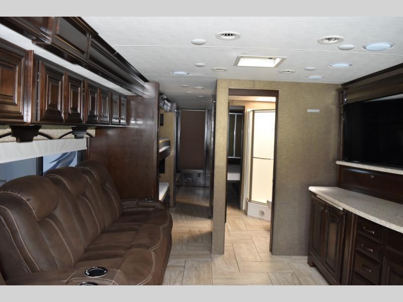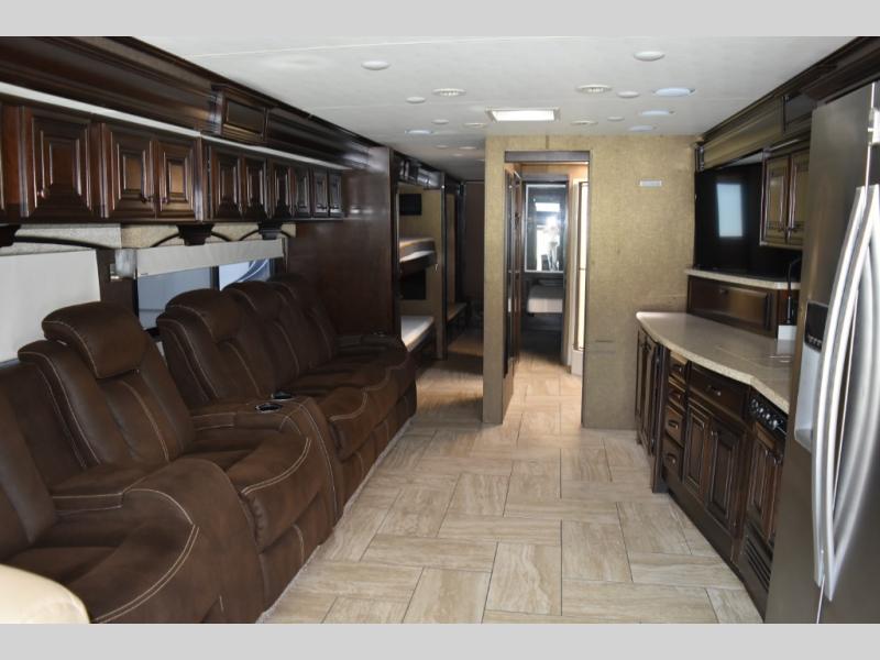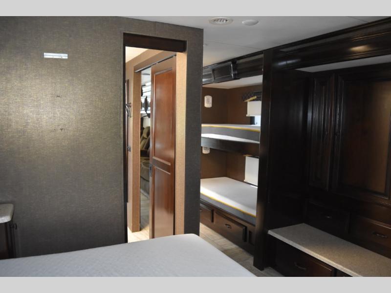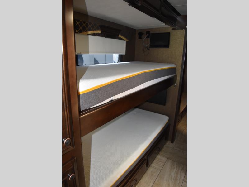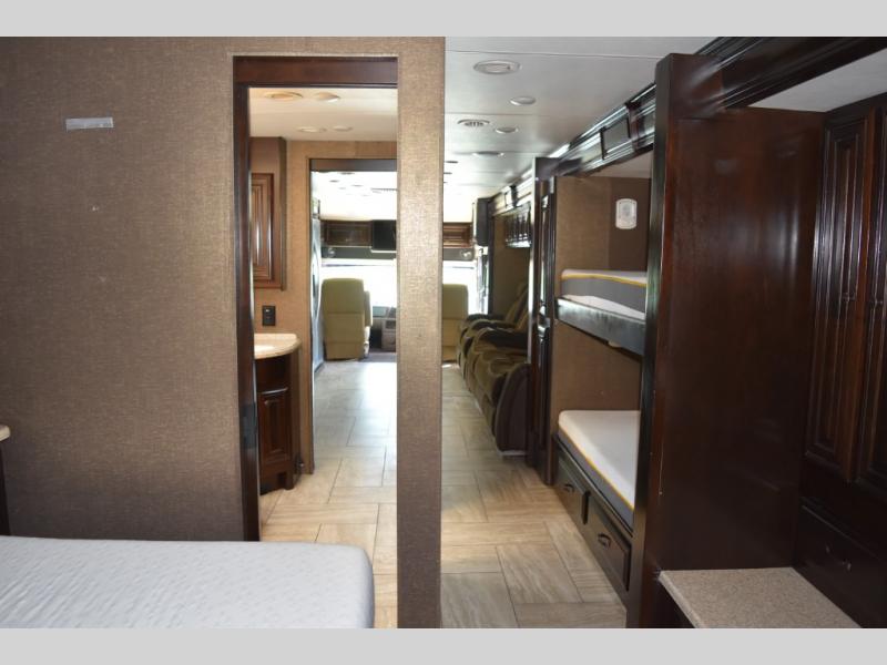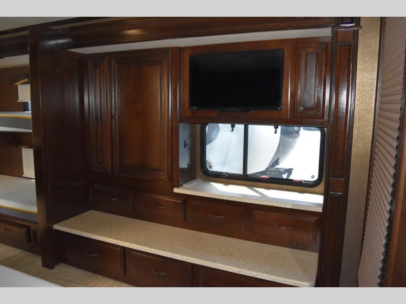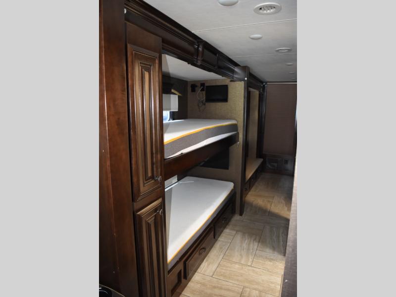 The main living area has two slides which really help to open up the living space. The slide behind the driver's seat has a refrigerator, three burner range, microwave, double kitchen sink, 48" LED HDTV, and French door pantry. On the opposite side of the motor home there is a full wall slide with a dream dinette which also makes into a sleeping space, sofa with air bed, linen cabinet, bunk beds with dual 13" LED TVs, and in the rear bedroom there is a dresser, closet, and 32" LED HDTV.