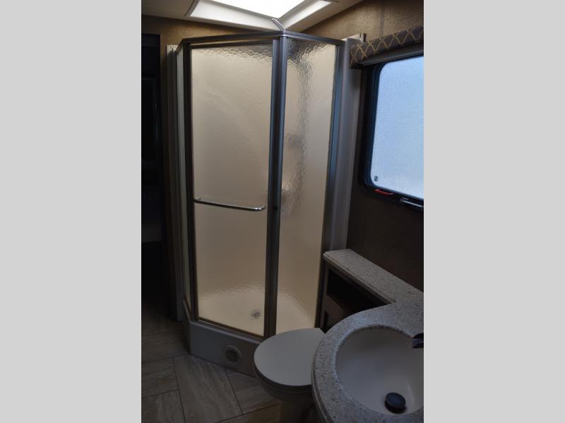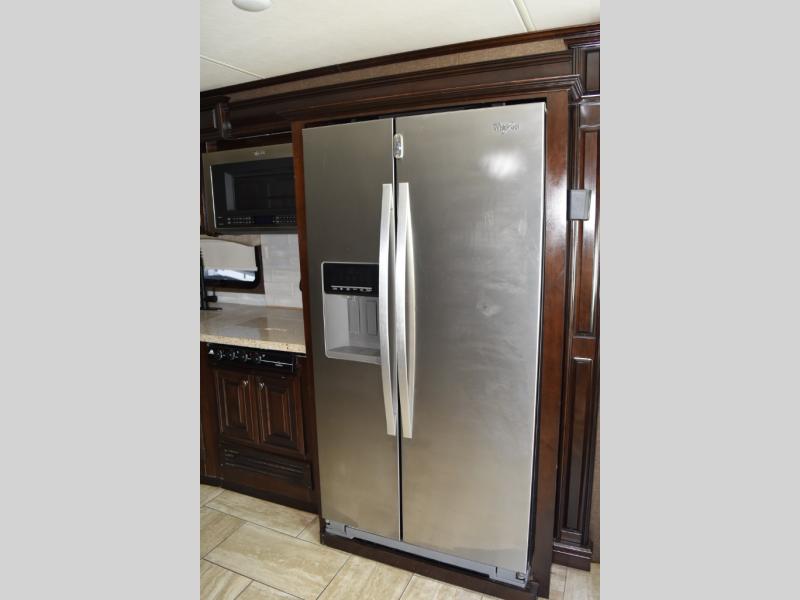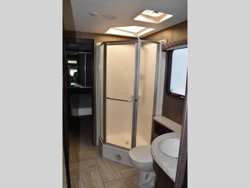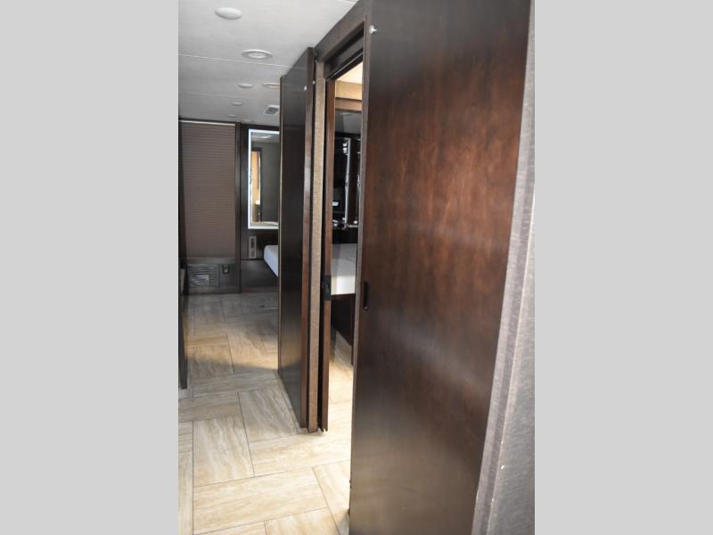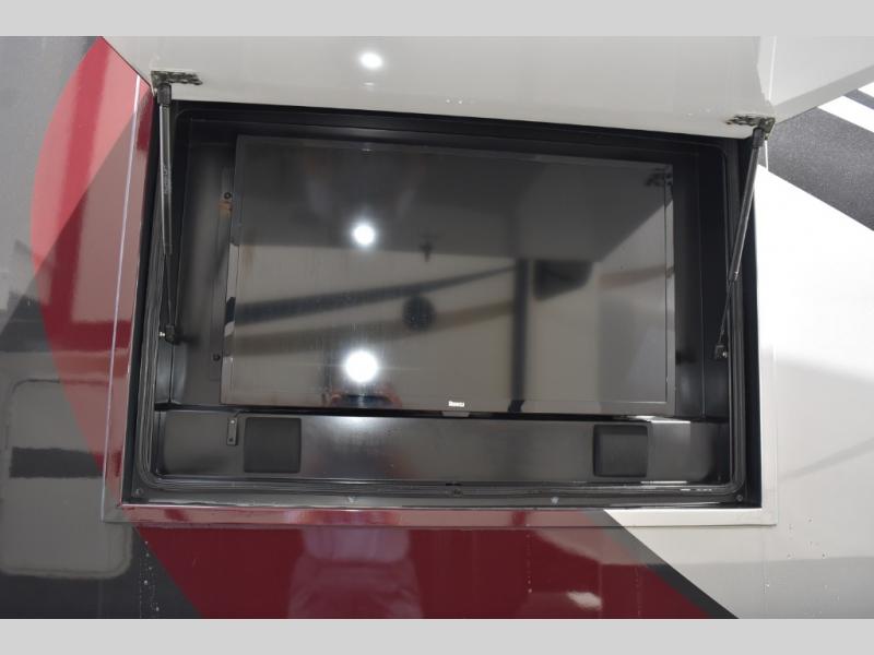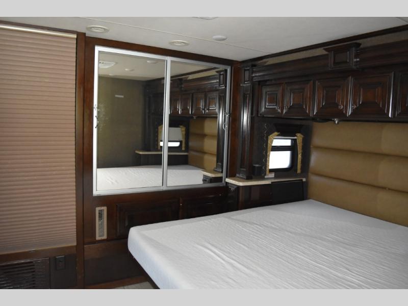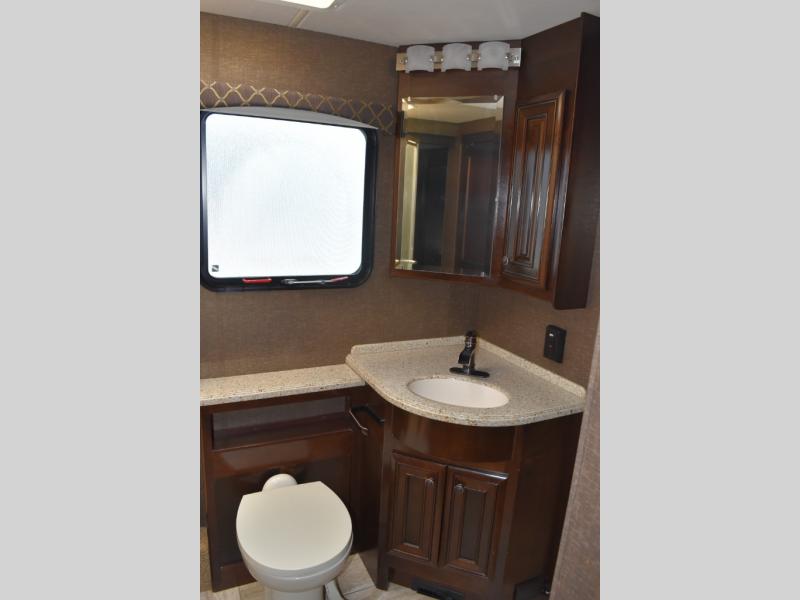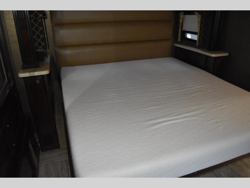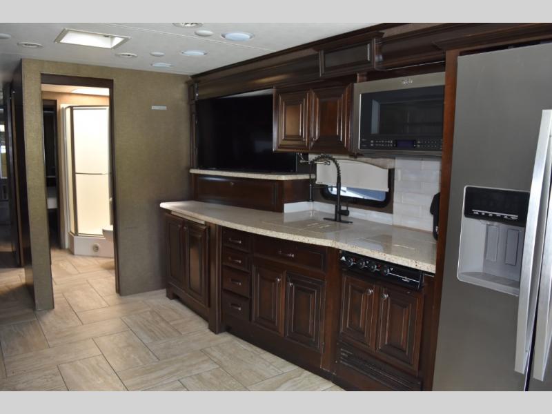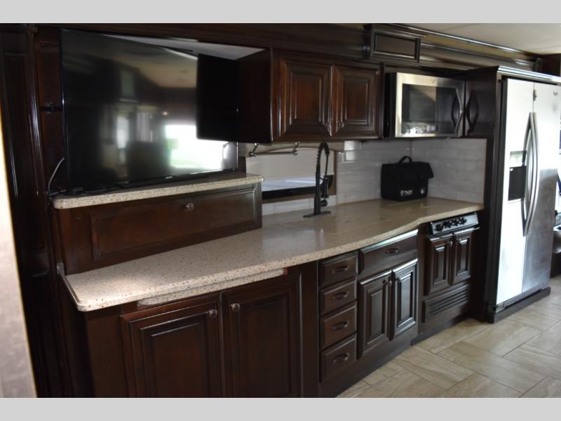 The main living area has two slides which really help to open up the living space. The slide behind the driver's seat has a refrigerator, three burner range, microwave, double kitchen sink, 48" LED HDTV, and French door pantry. On the opposite side of the motor home there is a full wall slide with a dream dinette which also makes into a sleeping space, sofa with air bed, linen cabinet, bunk beds with dual 13" LED TVs, and in the rear bedroom there is a dresser, closet, and 32" LED HDTV.