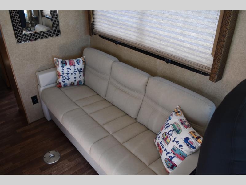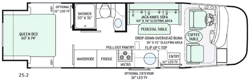Step inside behind the front passenger seat where there is a 32" LED TV overhead. Straight in from the door is a jack-knife sofa with seat belts for safe traveling. There is also a pedestal table for meal time, and the sofa can easily be made into a sleeping space that is 60" x 74" for two extra guest.