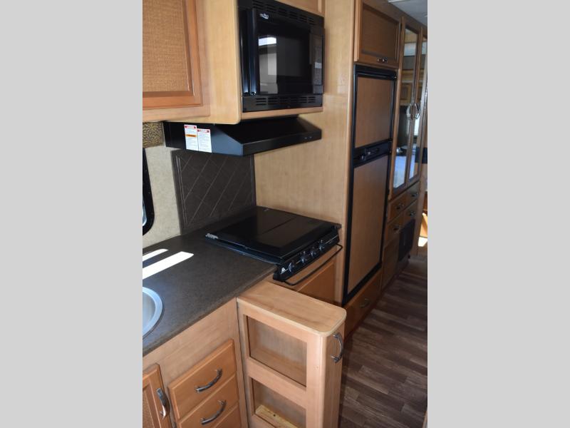 To the left of the main entry door find a round sink, counter space with a flip-up top extension, a three burner range with overhead microwave above, pull-out pantry, and a refrigerator.