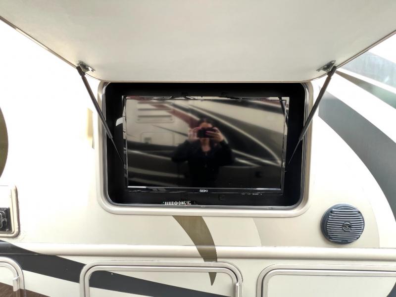 Step inside model 35C and see just how convenient your next road trip can be. There is a slide out dream dinette and theater seating for two opposite the entry door. With overhead storage above the theater seating, and two sets of seat belts, all of your guests and cabinet items will be secure while traveling. There is also a drop down overhead bunk above the cab area for added sleeping space if needed as well. The convenient coffee table between the captain's chairs allows for more table top space for just about anything. You can also choose a sofa with air bed in place of the theater seats if you like. Enjoy the 40" LED TV along the outer bathroom wall.