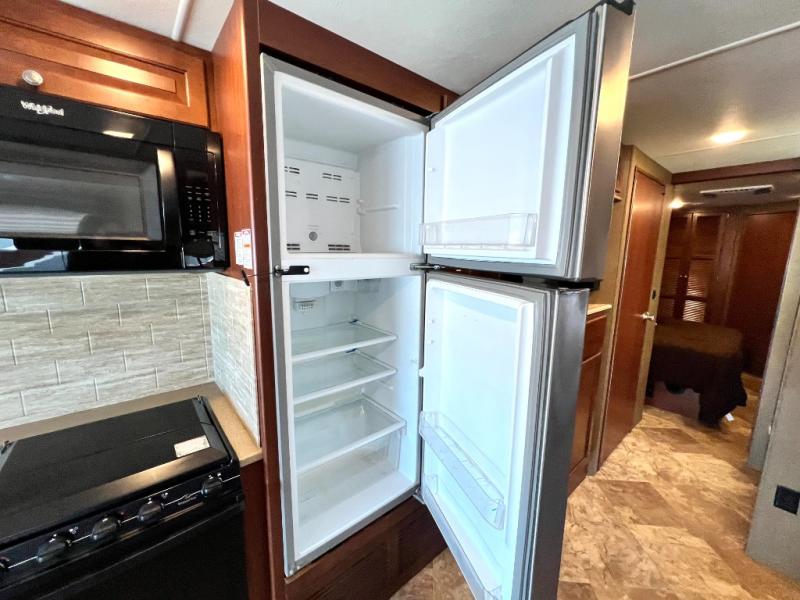 To the left of the entry door find a kitchen with all the amenities needed to create gourmet meals and snacks on the go. There is a double kitchen sink, a three burner range with overhead microwave oven, residential refrigerator, and a pull-out pantry. The pull-out pantry offers plenty of storage for dry and canned food items you wish to take along.
