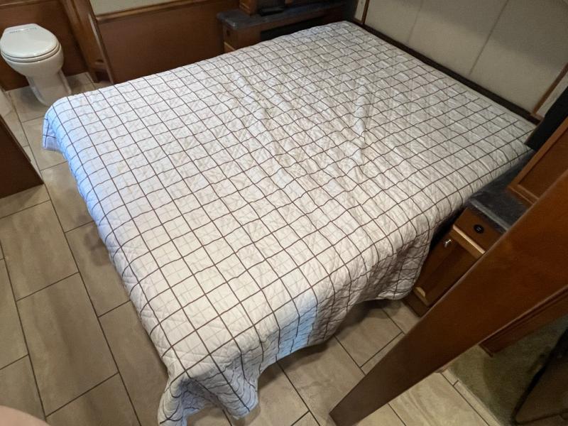 The private bedroom includes a queen bed slide with nightstands at each side and overhead cabinets. The wall opposite the bed includes a wardrobe with drawers below as well as a vanity with a TV and overhead cabinets above.