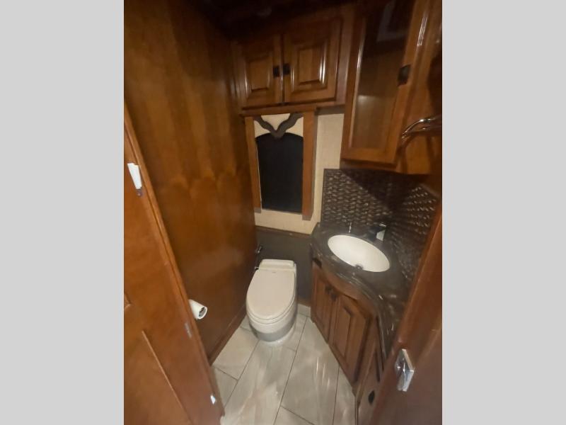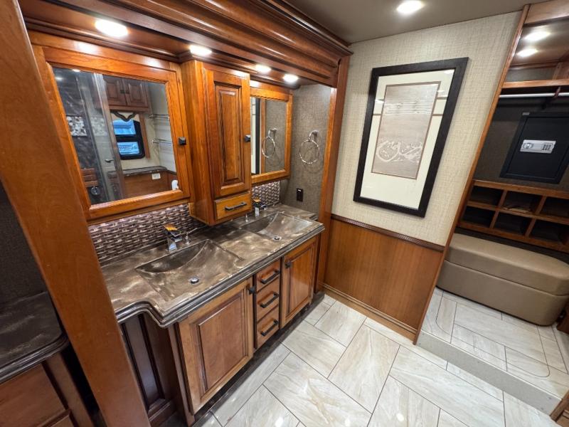 The bedroom has two slides. The first slide has a queen bed or you can choose an optional king if you prefer a bit more room while you sleep. On either side of the bed there is a nightstand, and above you will find an overhead cabinet. Across from the bed there is a TV, drawers, and in the bathroom there are his and her sinks. Across from the sinks you will find a shower and toilet.