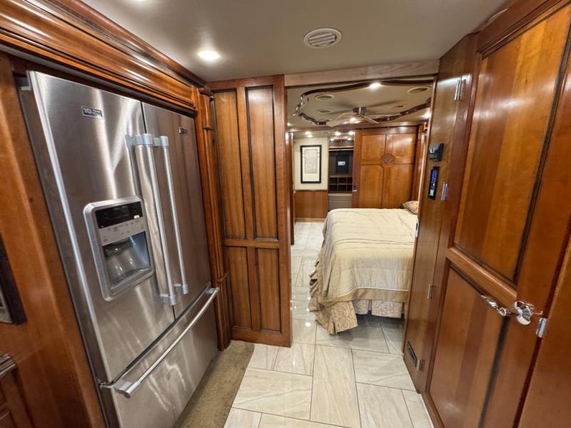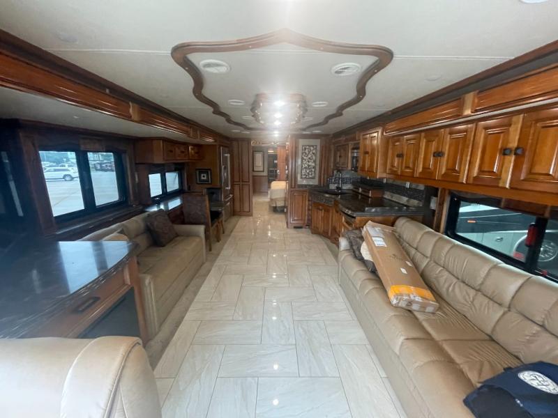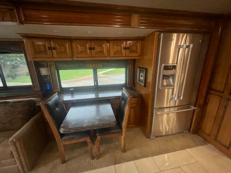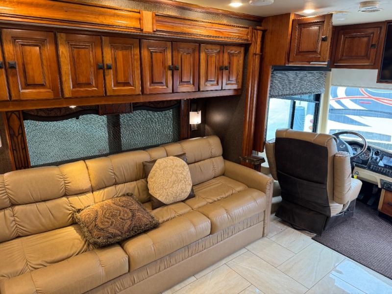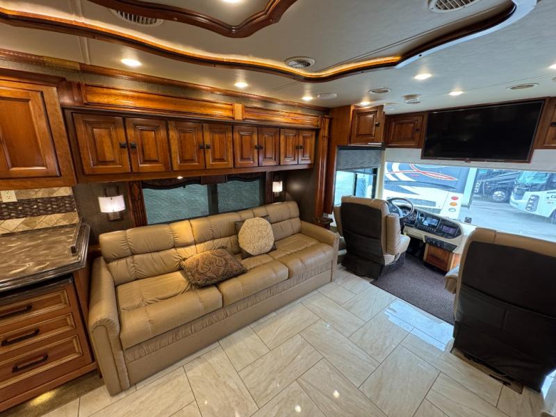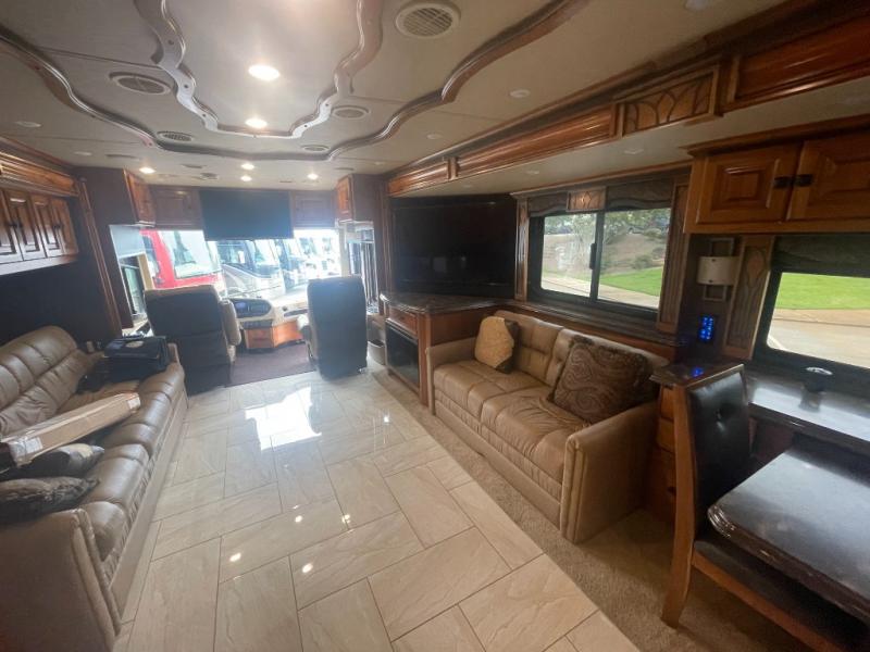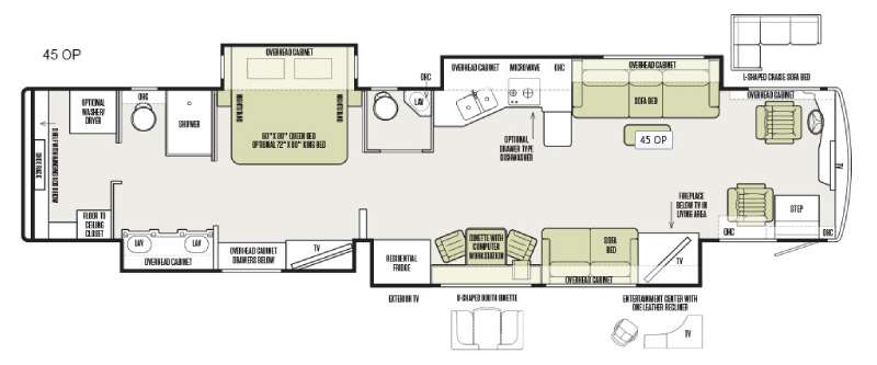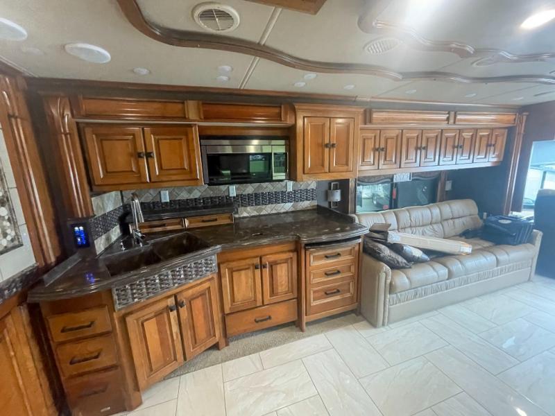 As you enter the motor home, in the front cab there is an overhead TV. The kitchen and living areas are open and spacious with two slides. One slide has a TV with a fireplace below the TV, sofa bed, dinette with computer work station, and a refrigerator. Overhead cabinets can be found in that slide. On the opposite side of the motor home there is another slide with a sofa bed and ottoman, two burner range, microwave, and angled double kitchen sink.