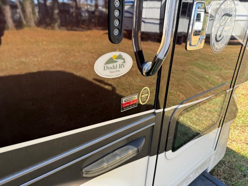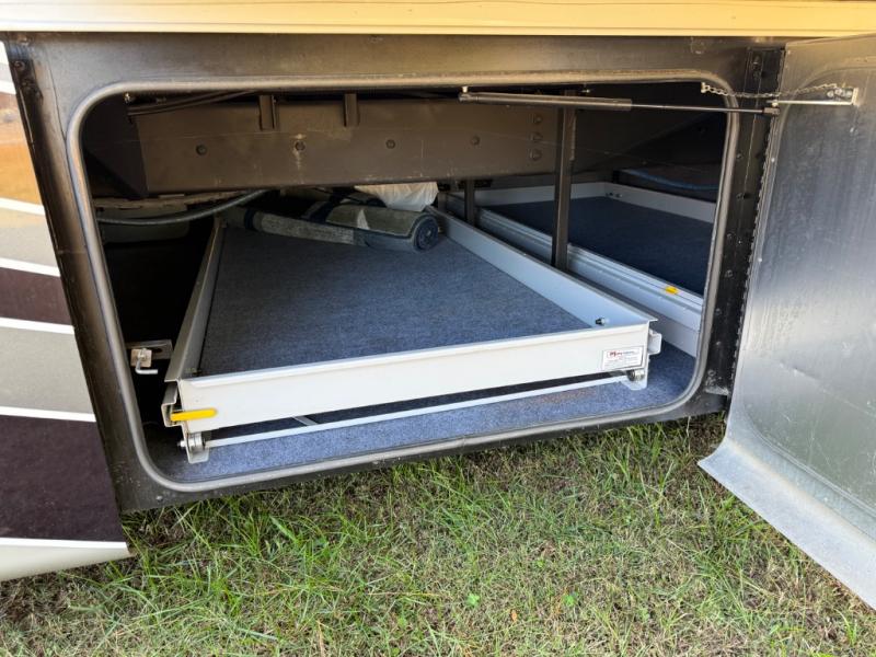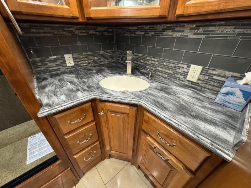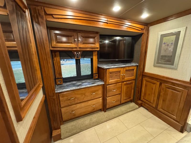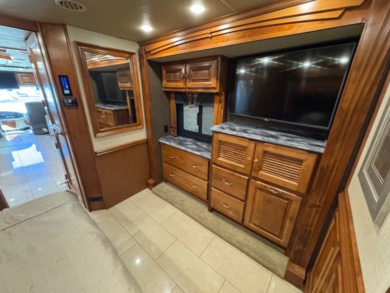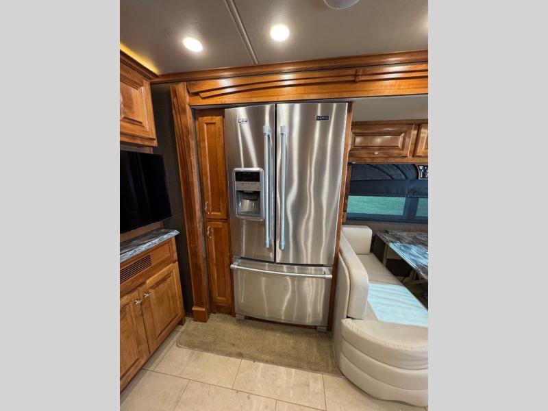 Moving down the road side, the slide has a sofa bed, booth dinette, overhead cabinets, residential refrigerator, and pantry. You may also choose the following optional items for the slide, a u-shaped booth dinette, a dinette with computer workstation, an entertainment center with one leather recliner, and leather recliners. Just back inside the coach, there is a TV facing the front with the option for a fireplace below.