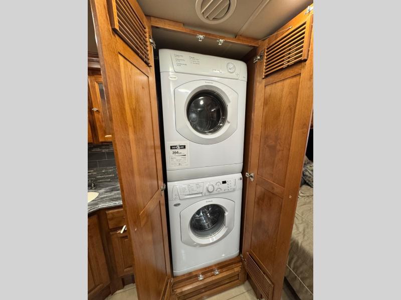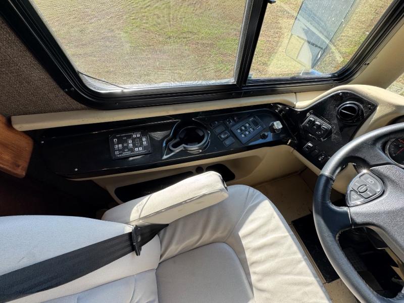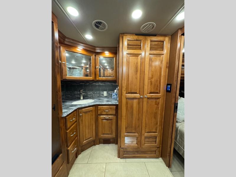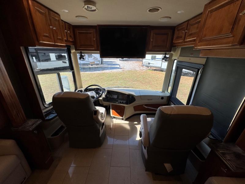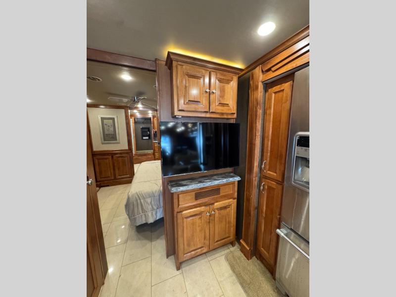 As you enter this class A diesel motorhome at the front curb side, the front of the coach includes lots of overhead cabinets as well as a center mounted TV.