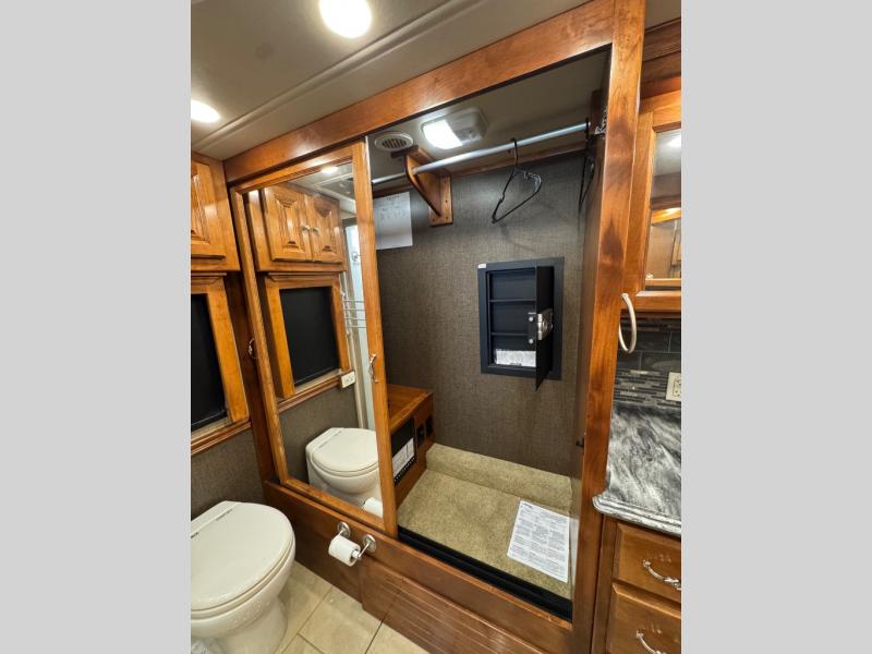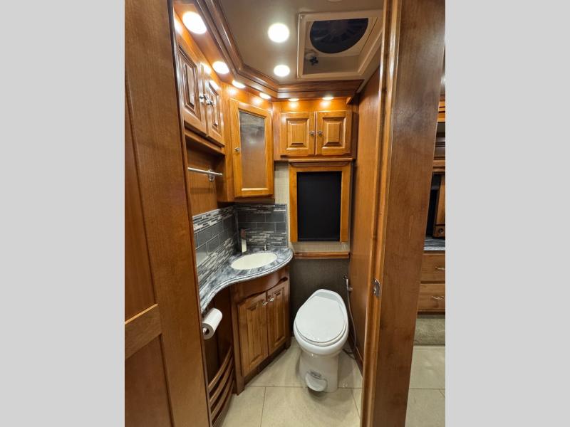 Across the motorhome, a half bath includes a toilet, vanity sink and overhead cabinets.