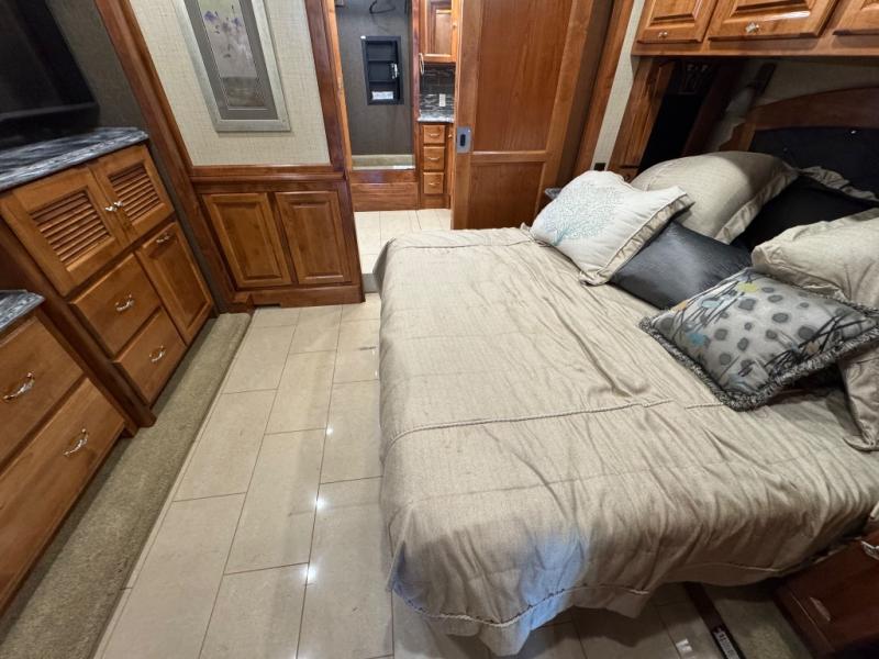 As you move to the rear, the bedroom includes a slide out with a queen size bed or optional king, with nightstands at each side and overhead cabinets. The opposite wall has a TV, overhead cabinets and drawers below.