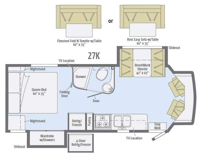 Step inside and notice the slide out BenchMark dinette straight ahead featuring four sets of seat belts to keep your backseat travelers safe. This can easily be made into additional sleeping space for one extra guest. You can also choose a Rest East sofa or a Fold N Tumble sofa both with a table included in its place if you wish.