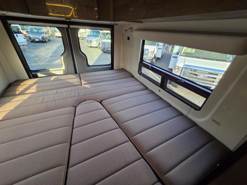 Enter model 70A through the sliding door on the passenger side and find a seating area where the front cab seats can be swiveled around. There is a place for a removable pedestal table between the two, which is the perfect place to enjoy your morning cup of Joe! A 36" x 66" sofa bed for one is found just behind the driver's seat straight across from the curb side sliding door.