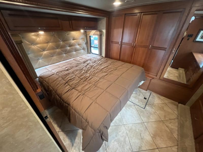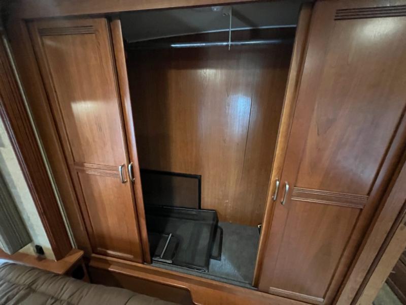 The rear master bedroom features a queen bed slide including nightstands and overhead storage. The chest of drawers opposite is part of the large slide on the road side that also features the kitchen appliances. Here you will enjoy storage drawers for your things, plus there is a 40" HDTV as well. Along the rear wall find even more storage with a wardrobe and storage cabinet. You can choose a king size bed if you wish for a bit more sleeping space, plus so much more!