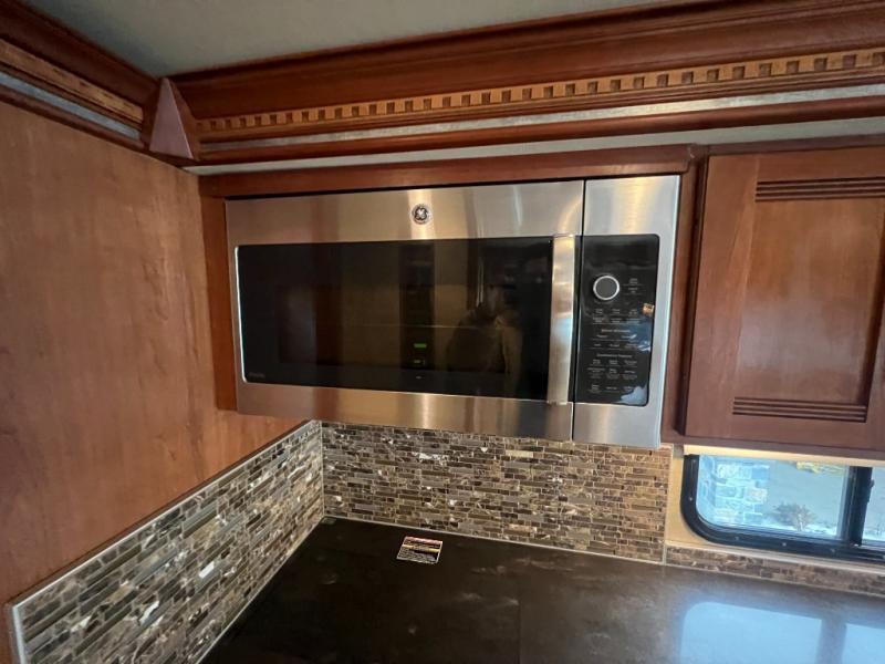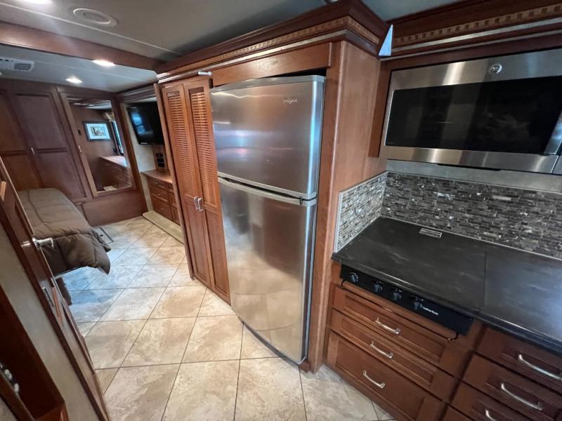 Heading further back you will come to the kitchen and bath area. The kitchen begins at the head of the driver's side slide out with an angled double sink, a three burner range, and a residential refrigerator. There is also a storage cabinet that can be the location of the washer and dryer if you wish to add that convenience. Here you will have no problem creating meals and snacks while on the move.