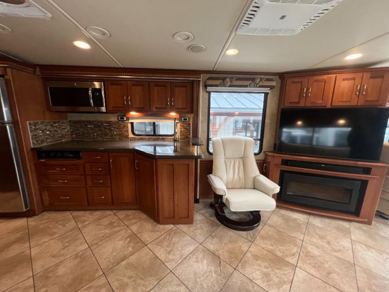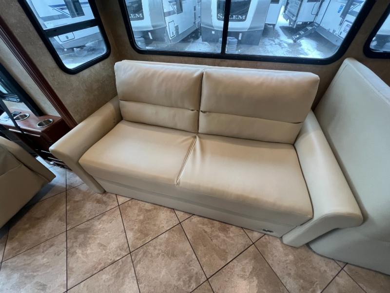 Enter model 36G in front of the passenger seat. Looking back you will see a spacious interior with a slide out Flexsteel fold-n-tumble sofa and Benchmark dinette on your left. Notice the seat belts which are great for rear travelers. Opposite you will find a recliner with pull-out flip-out table, and a corner location for the 48" HDTV, and optional fireplace if you choose to add.