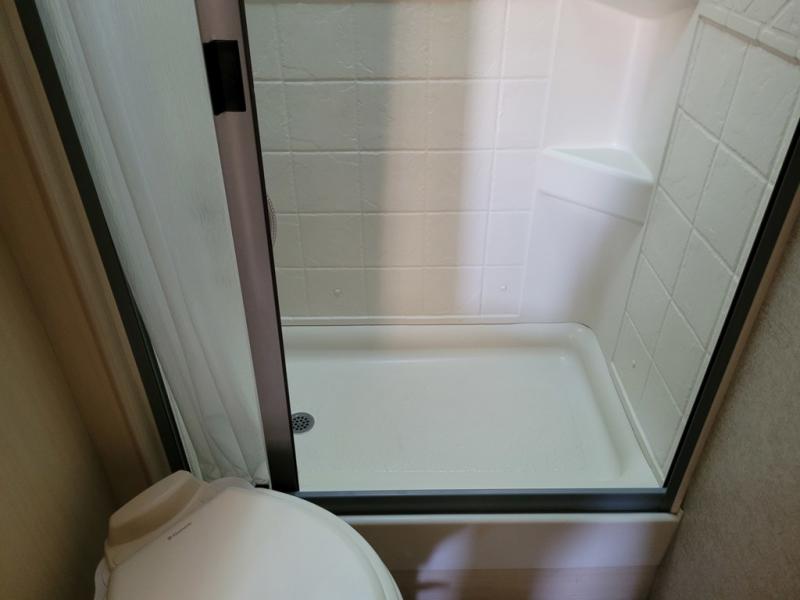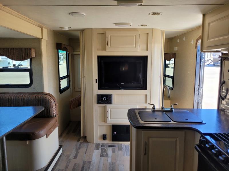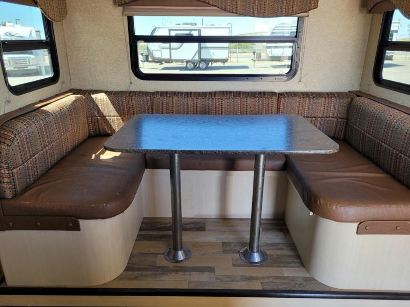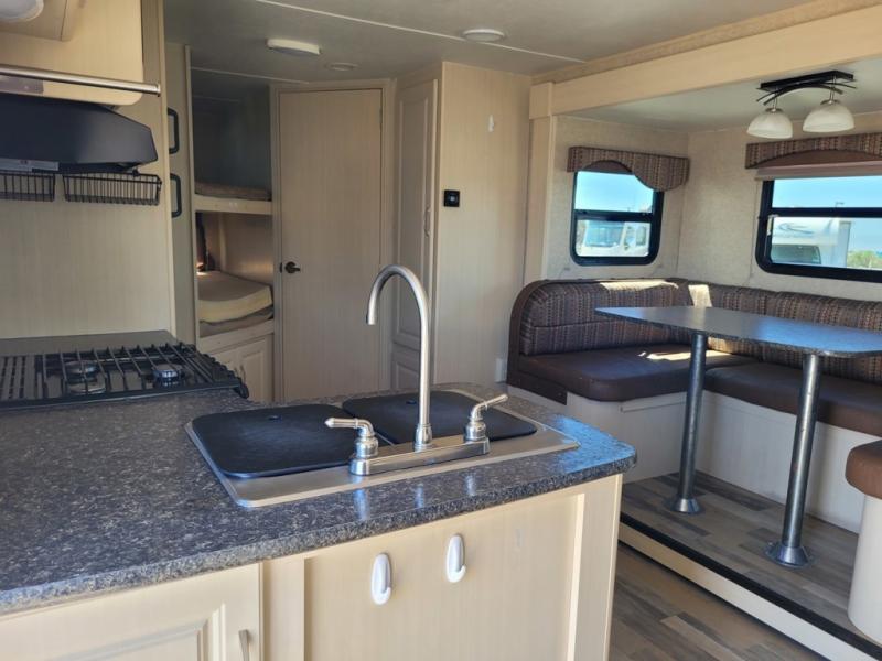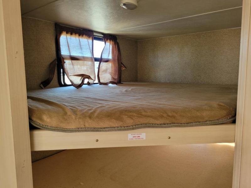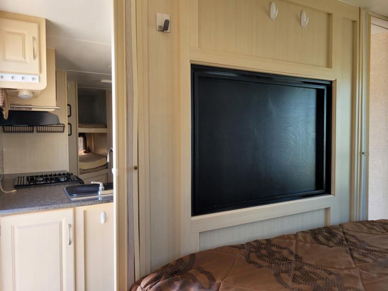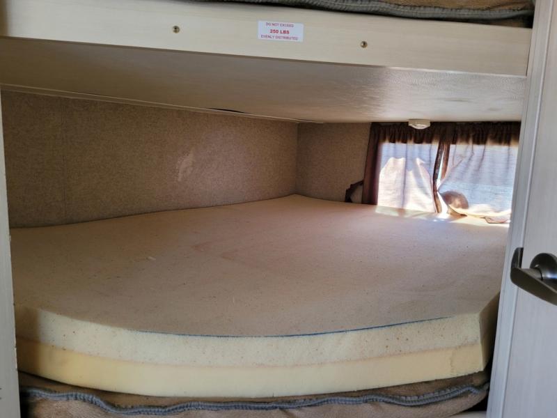 What I liked most: The dining booth area looks like it has a larger seating capacity than other similar sized towables. The walk through storage next to the bunks is convenient. The entertainment center has a very appealing look with its curved sides and light colored wood.