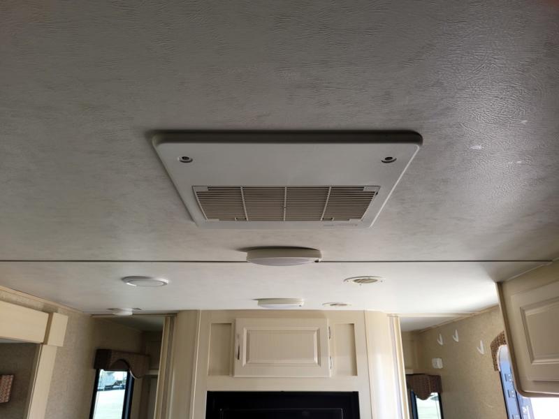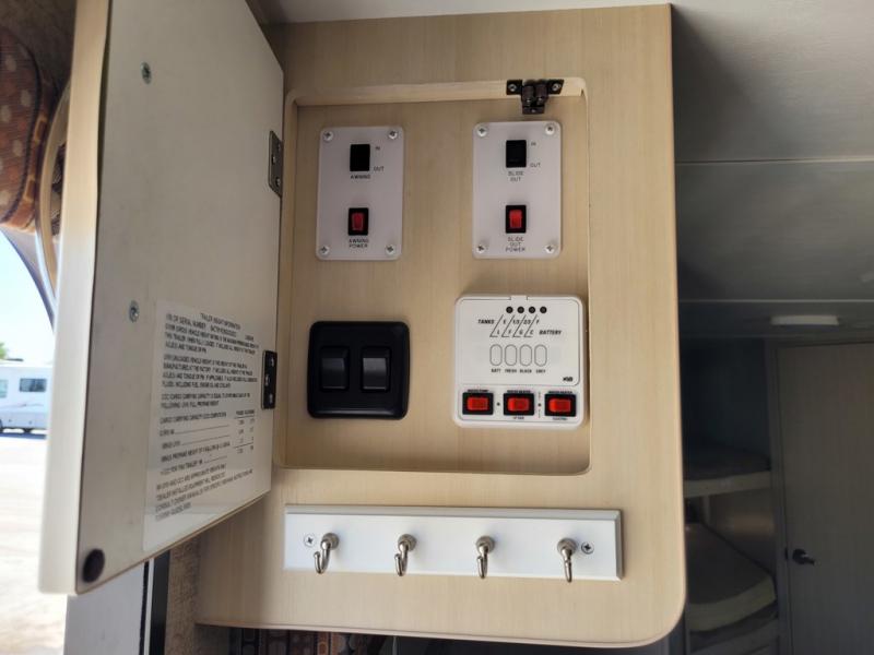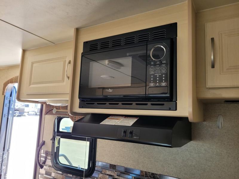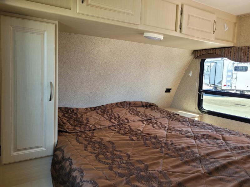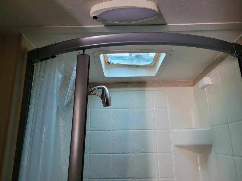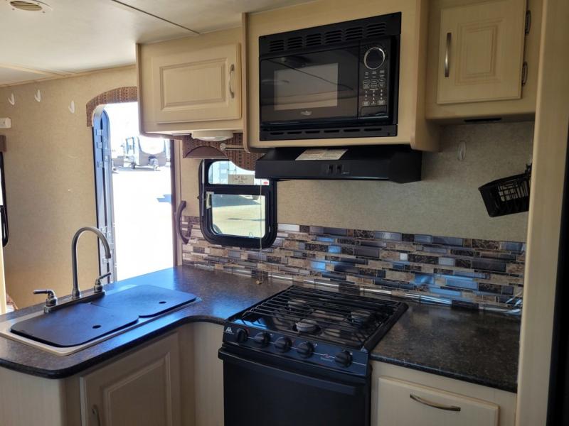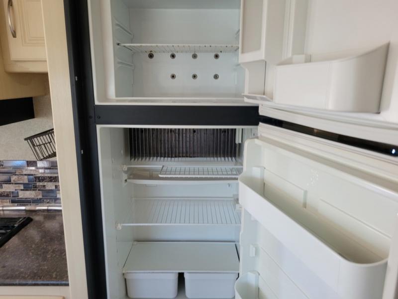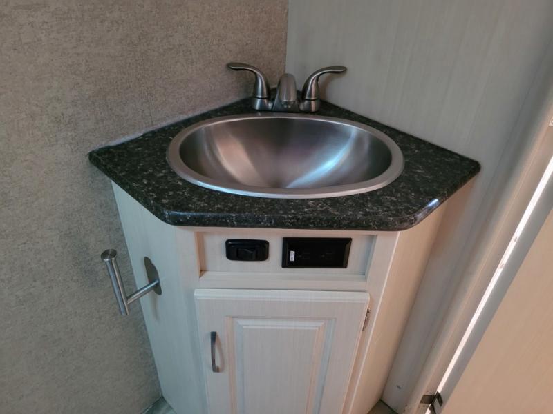 What I liked most: The dining booth area looks like it has a larger seating capacity than other similar sized towables. The walk through storage next to the bunks is convenient. The entertainment center has a very appealing look with its curved sides and light colored wood.