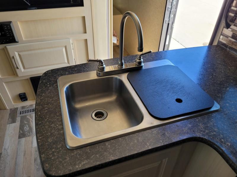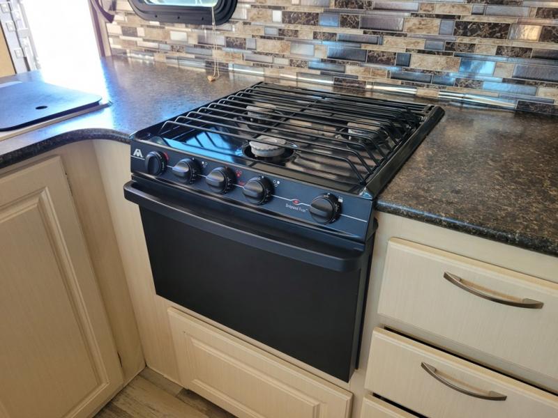 Along the road side find a slide out u-shaped dinette featuring plenty of seating space for everyone. Across the room to your immediate left at the entry door find a l-shaped counter-top with a double kitchen sink. As you continue along the curb side wall find a range with microwave oven overhead, and a refrigerator, plus overhead storage for dishes and things.