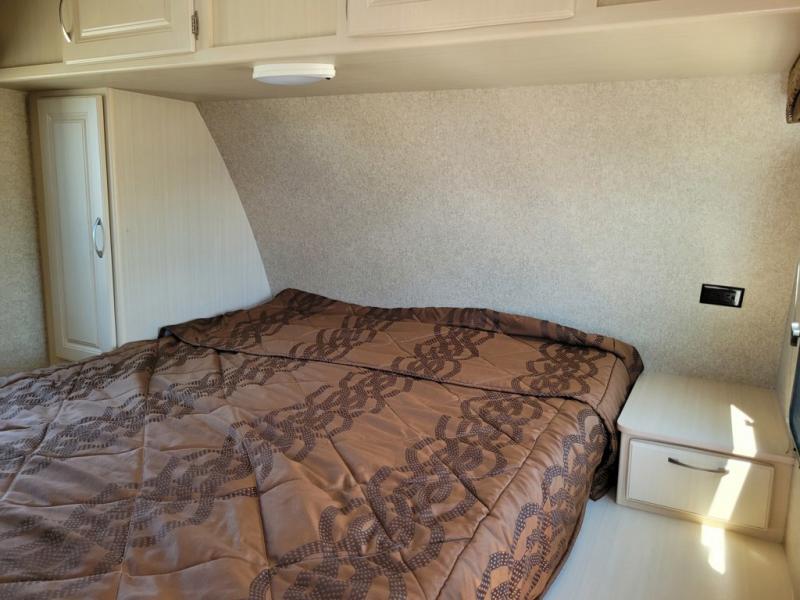 As you step inside to your right, there is a queen bed with a wardrobe and nightstand, plus an overhead cabinet for added storage. Off the foot of the bed a TV cabinet that is easily viewable throughout the space.