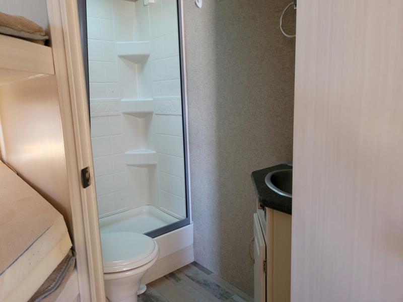 The rear left corner features a set of double bed bunks that the kids are sure to love. The right side features a bath including a shower, toilet, and a vanity with a sink including a medicine cabinet above. A wardrobe is located just outside the bathroom for additional storage needs.