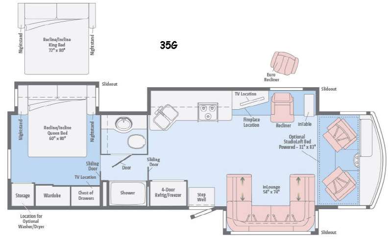 Choose an optional king size bed, Euro recliner, and/or StudioLoft bed above the cab area that is powered, plus so much more!