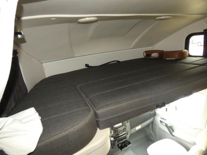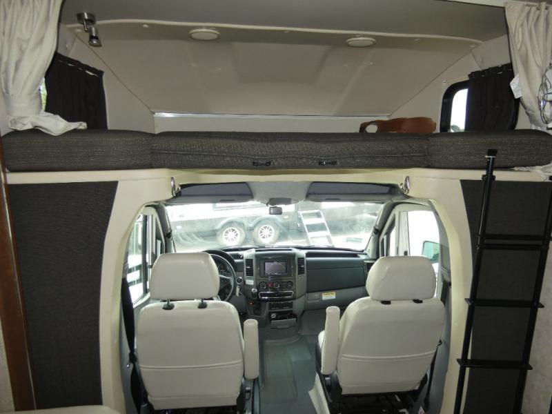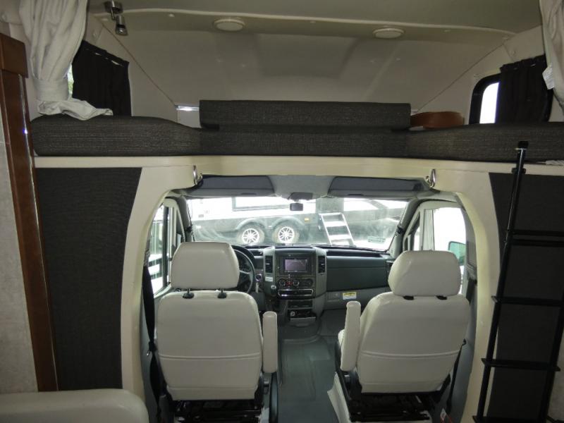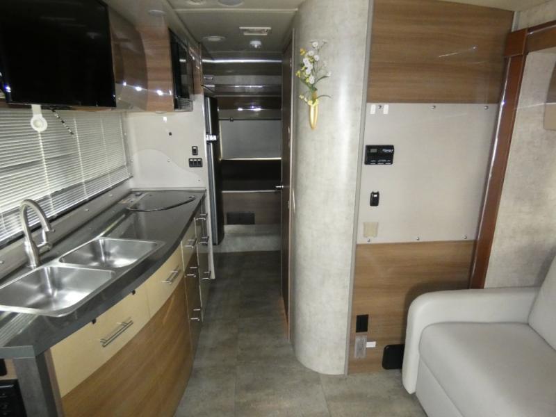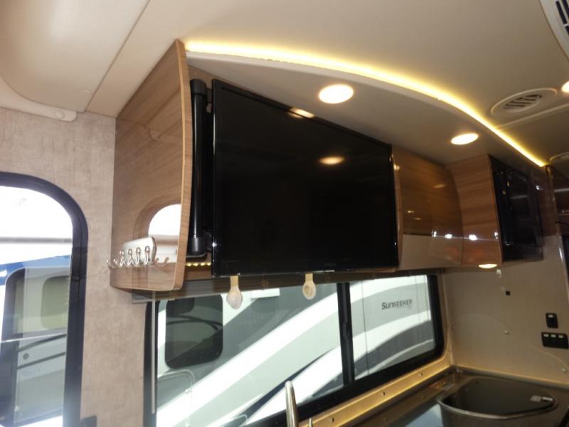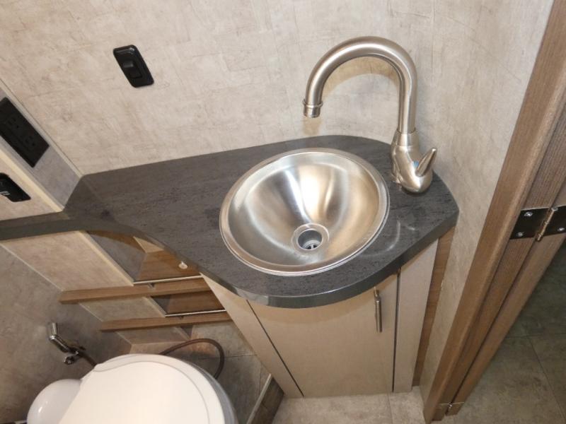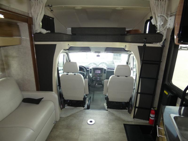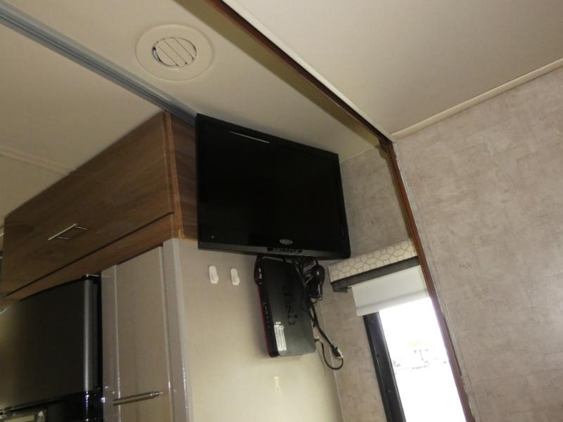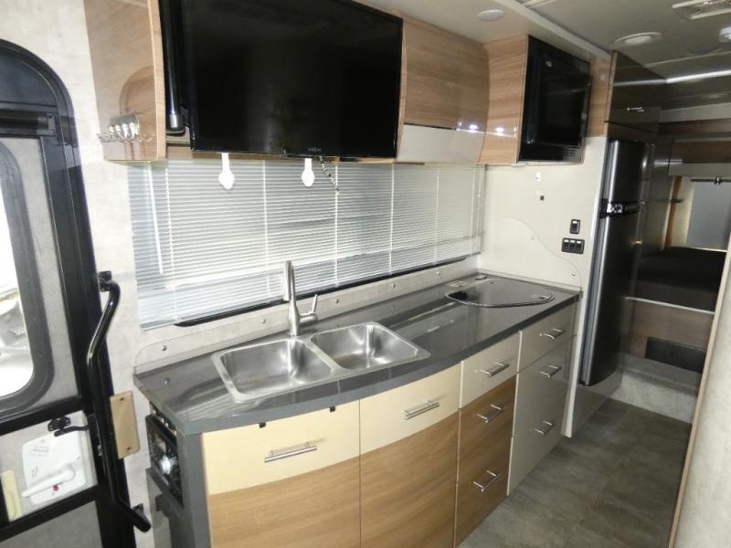 The kitchen is to the left of the entry door and features a double sink, counter space, a two burner cook-top, pantry, and refrigerator. You will also find plenty of overhead cabinets for storage too. A 28" HDTV is located above the sink area making it viewable from the sofa and front seats when swiveled, plus the cabover bunk.