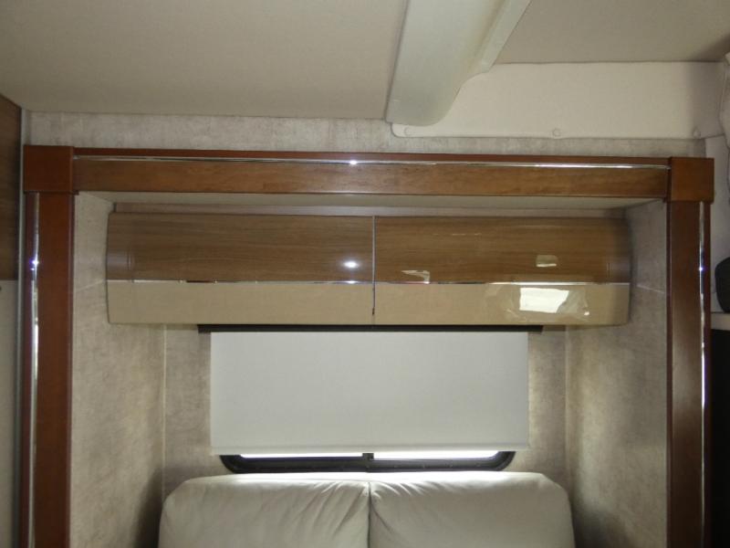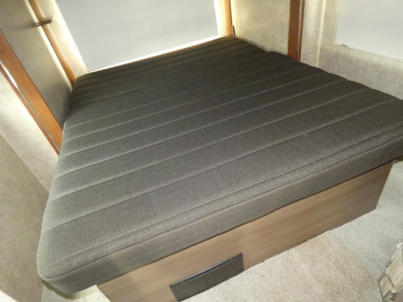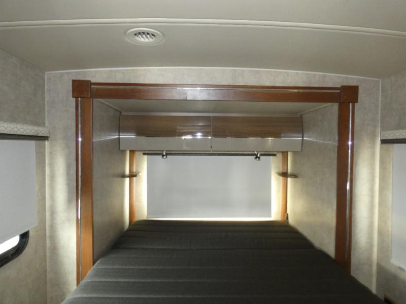 The rear bedroom in model 24G features a slide out rear queen sized bed with dual bedside storage cabinets, plus overhead cabinets space as well.
