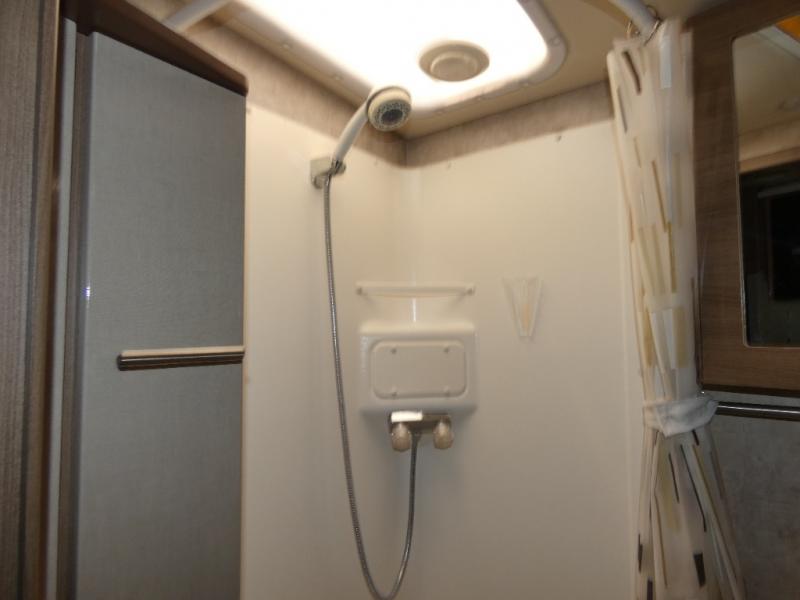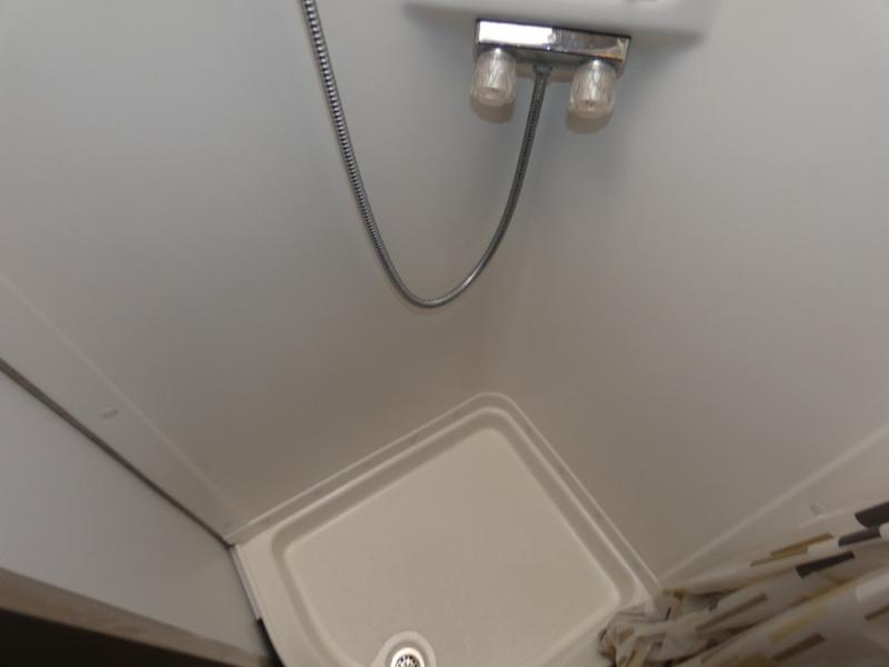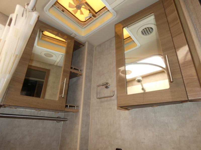 Beyond the sofa heading toward the rear of the coach you will find a complete bath with corner shower, toilet, linen cabinet, and vanity with round sink. A nice size wardrobe is found just around the corner from the bath before you step up to the bedroom floor area.
