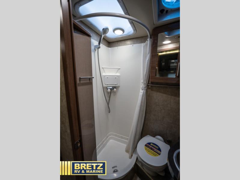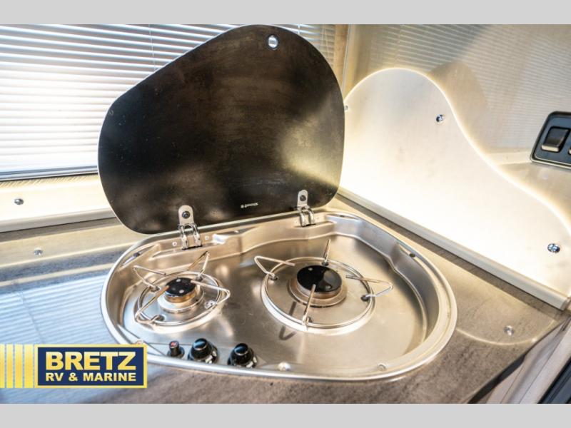 The kitchen is to the left of the entry door and features a double sink, counter space, a two burner cook-top, pantry, and refrigerator. You will also find plenty of overhead cabinets for storage too. A 28" HDTV is located above the sink area making it viewable from the sofa and front seats when swiveled, plus the cabover bunk if you choose to add.