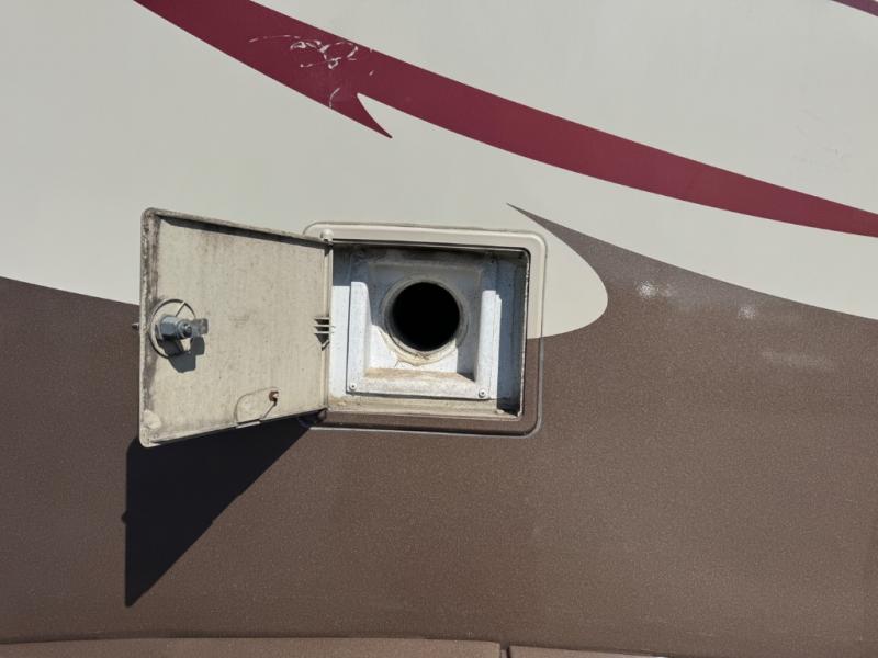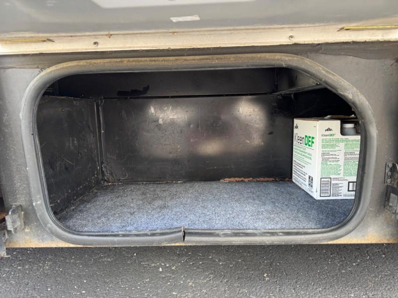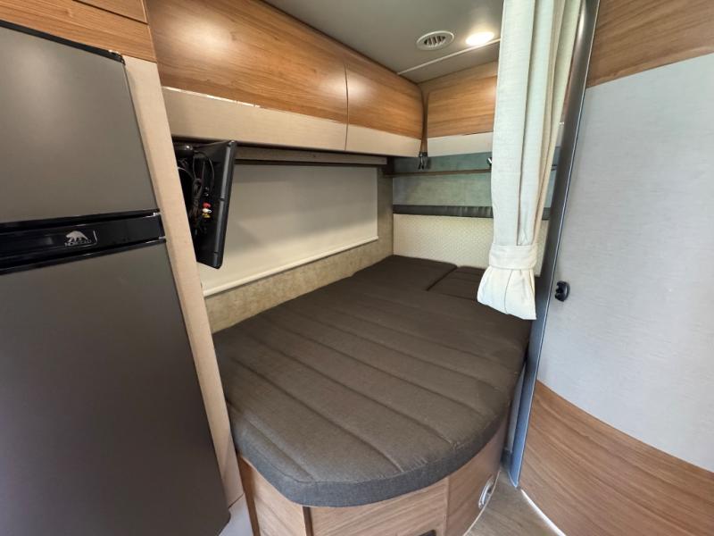 The rear double bed offers storage along the head of the bed, and also the curb side wall. There is a spot to add an optional flat screen 24" HDTV to the bedroom if you choose.