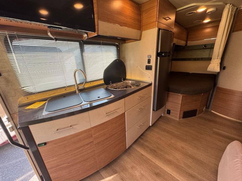 To the left of the entrance find all the kitchen amenities needed to create meals and snacks while you are on the road. There is a double sink, a two burner range top, overhead cabinets, and a refrigerator to keep your food items cold and fresh. The 28" HD TV is also located above the kitchen area which can easily be viewed from the dinette or front captains chairs.