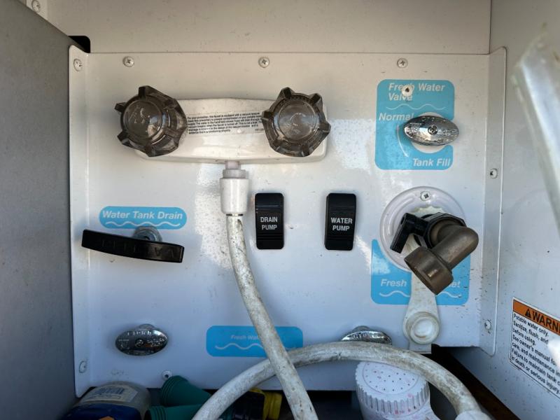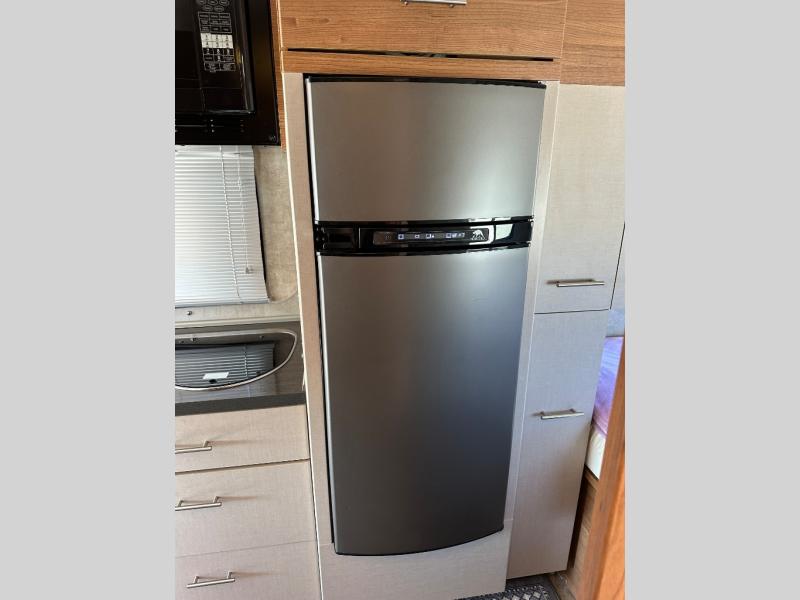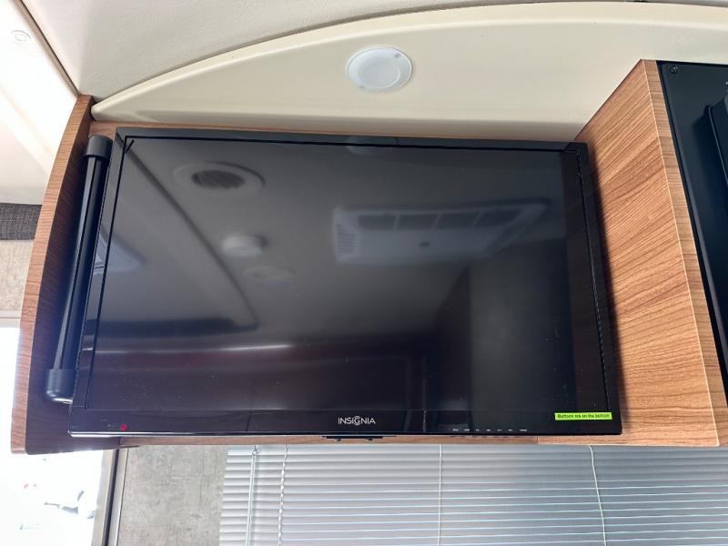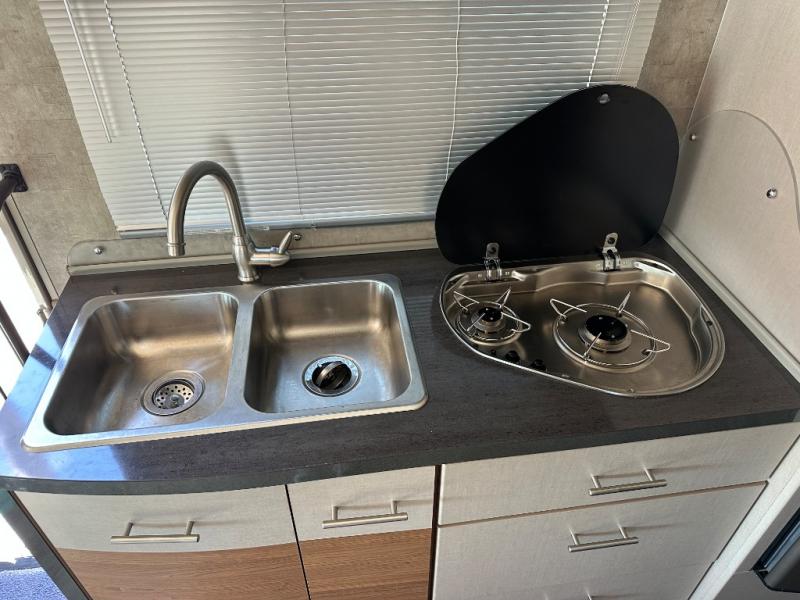 The kitchen area is to the left of the entry door and features a double sink, a two burner cook-top, and refrigerator. You will find a 28" HDTV mounted above the sink location.
