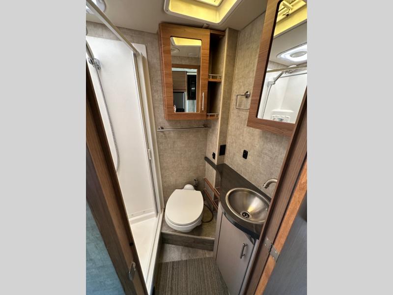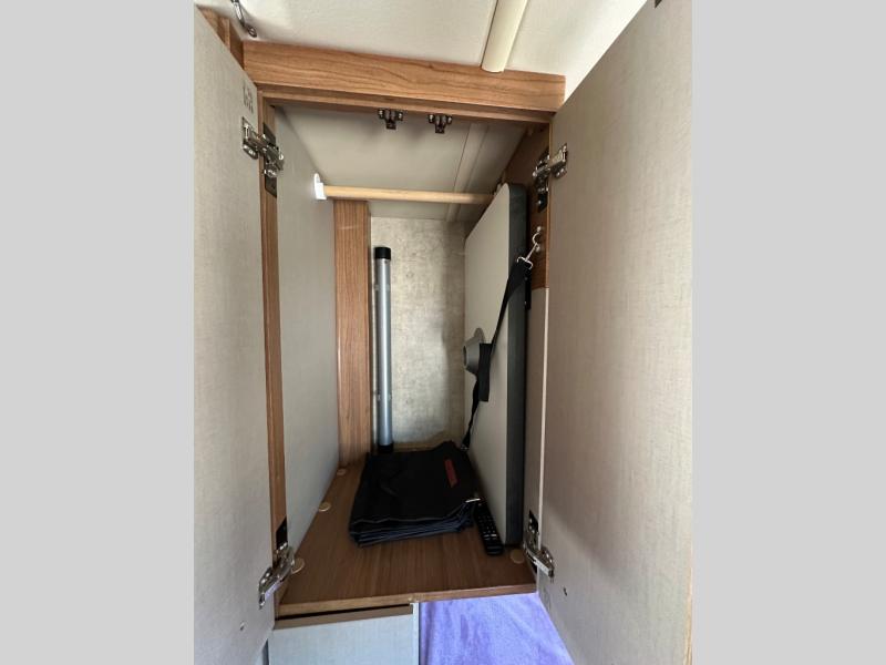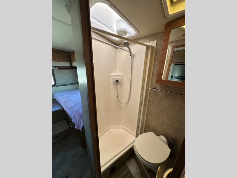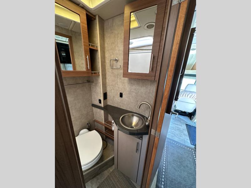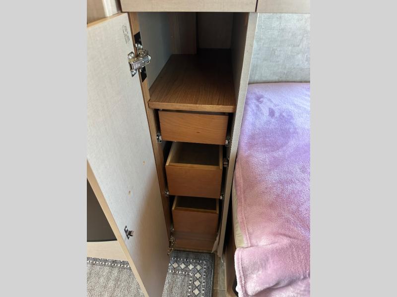 Beyond the sofa heading toward the rear of the coach you will find a side bath with corner shower, toilet, and vanity with round sink including a medicine cabinet overhead. A nice size wardrobe is found across from the bath before the rear bedroom area along the curb side wall.