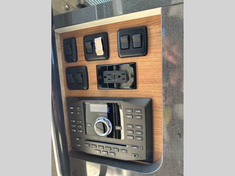 The rear sleeping space features twin beds that are 32" x 74" with the Flex Bed system you can easily create a 74" x 87" king size bed if you like, plus there is overhead storage as well. There is also a spot to mount an optional flat screen 24" HD TV in the bedroom just off the foot of the road side bed along the exterior of the bathroom wall.
