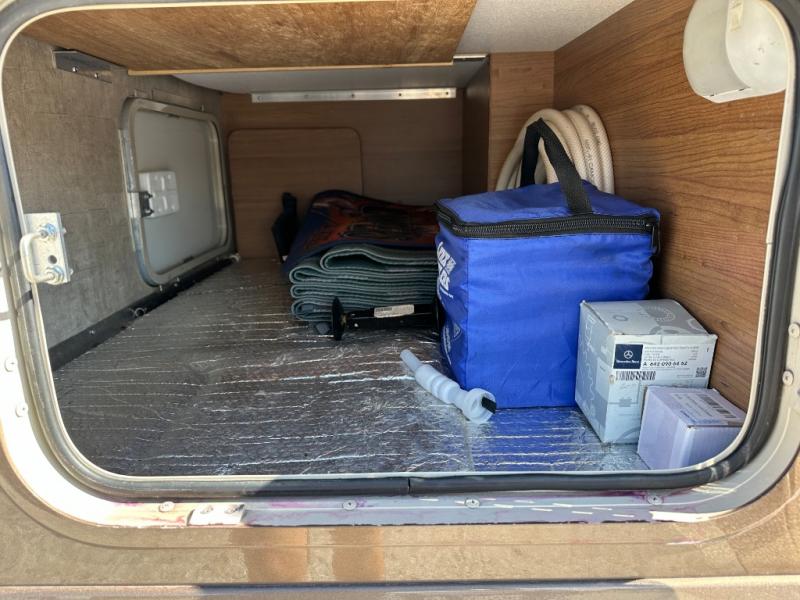There is a place for a moveable pedestal table that sits in the main room between the front driver and passenger seats when they are swiveled around.