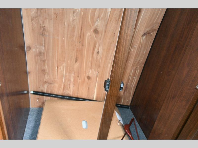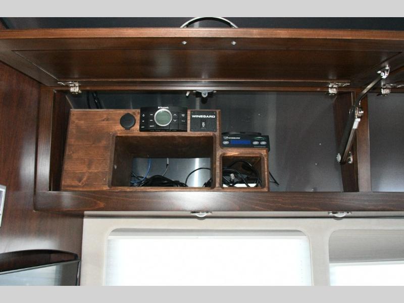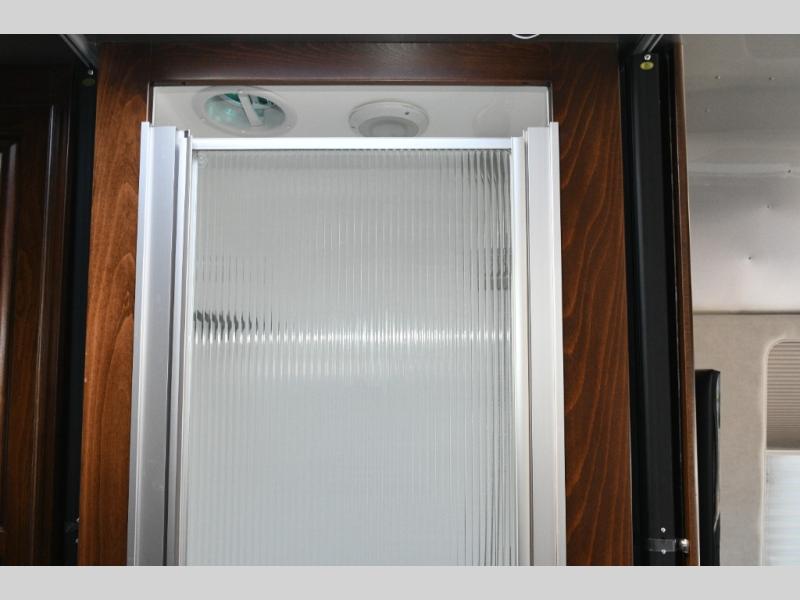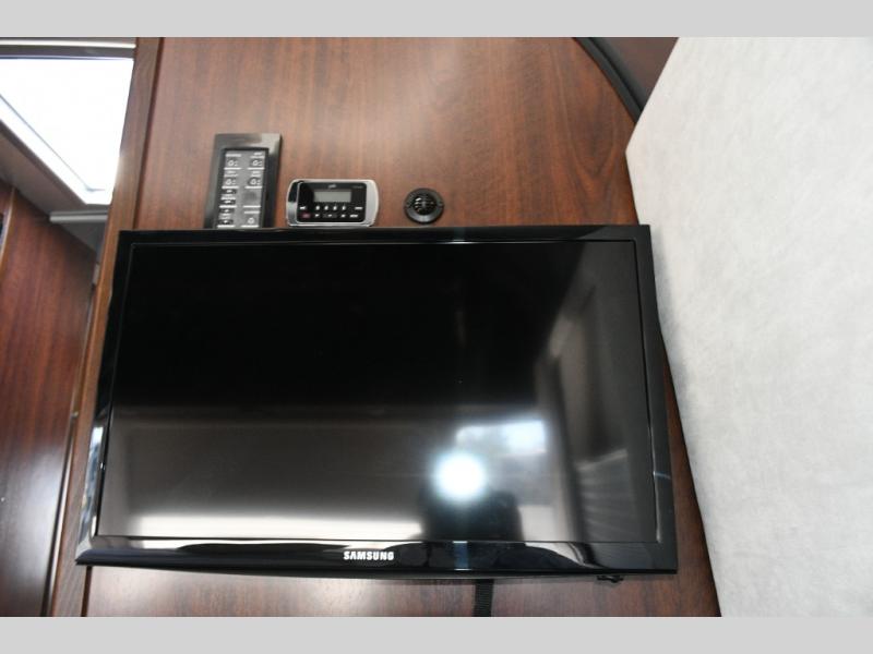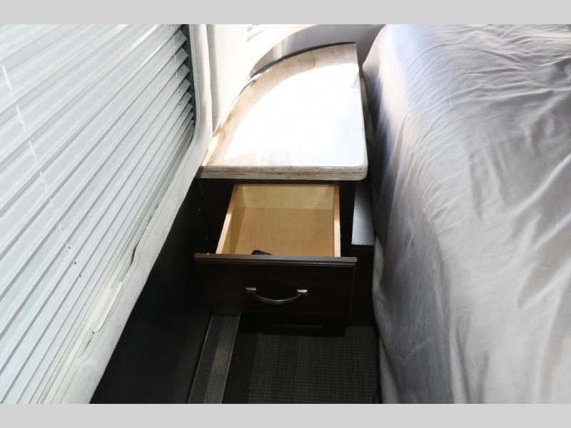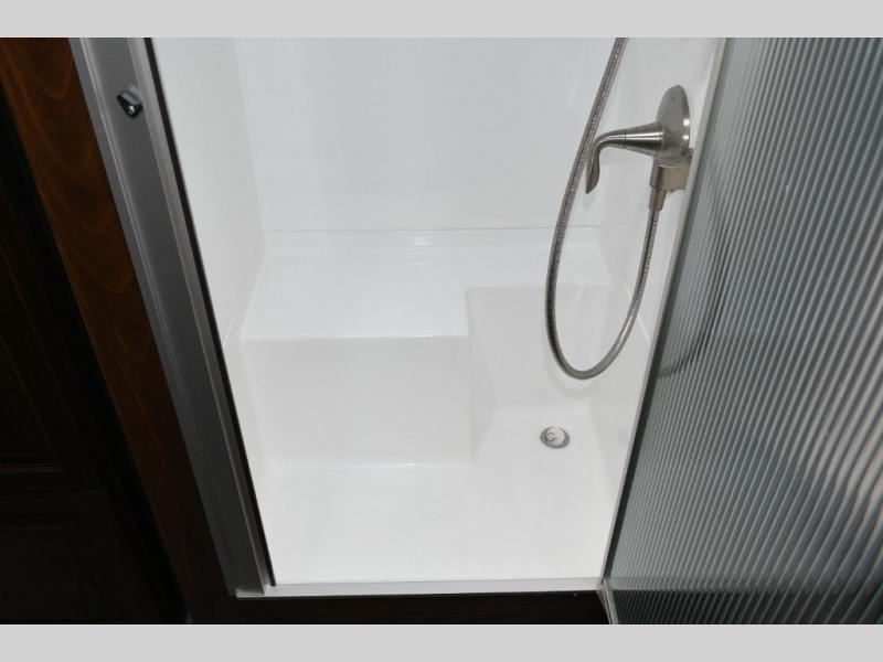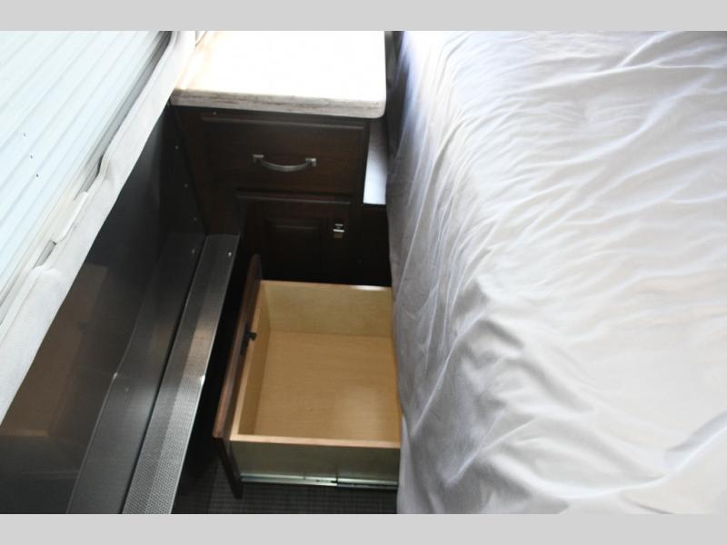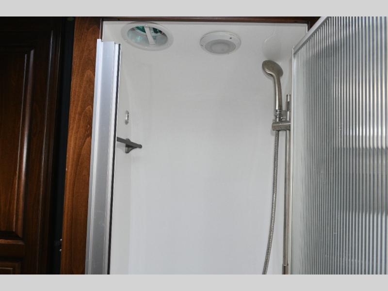 The split bath design allows two travelers to get ready at the same time. One side features a spacious shower, while the other offers a private toilet and sink with generous counter space. The rear bedroom is your personal retreat, complete with a power queen bed, nightstands, and an LED TV near the corner for easy viewing. Additional storage ensures your belongings stay organized throughout your trip.