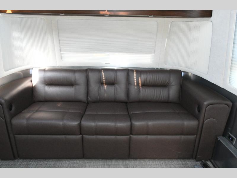 The rear of the trailer welcomes you with a cozy sofa featuring power recliners, ideal for relaxing while enjoying the LED TV. Across from the sofa, a booth dinette provides seating for meals, games, or work, and easily converts into a 42" x 76" bed for additional sleeping space when needed. Pull-back curtains offer privacy for dressing or sleeping.