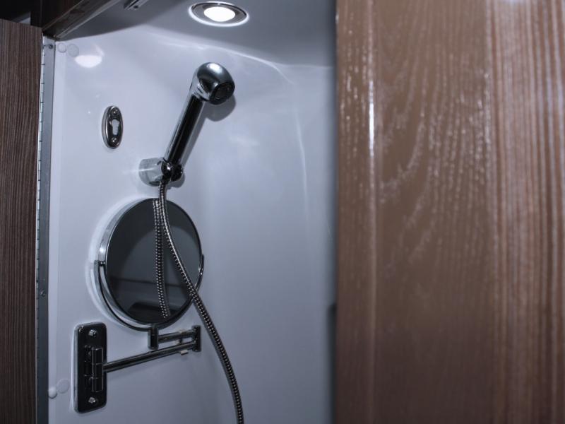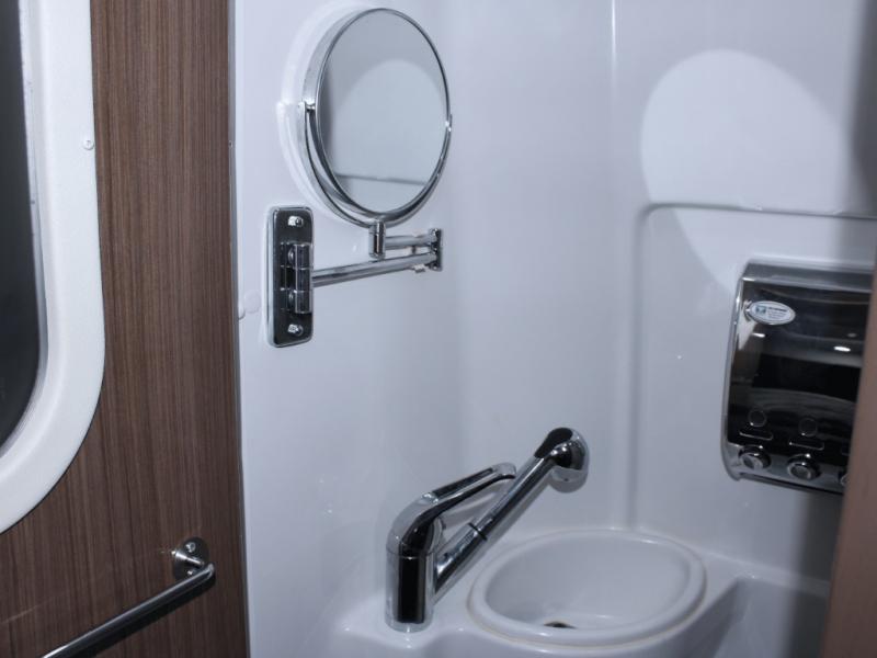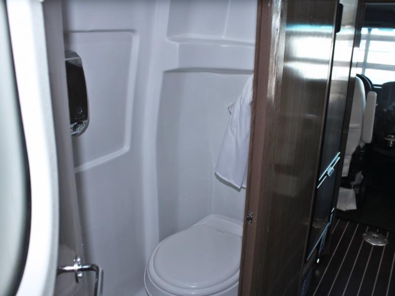 As you move toward the rear notice a convenient wet bath on your right which includes a toilet, small sink, and shower.