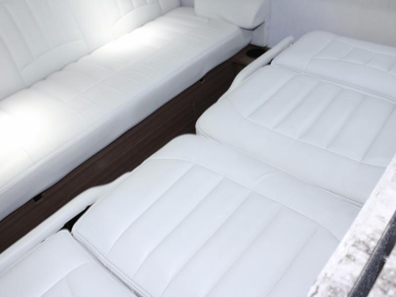 Continue further back and find another great conversation area that can convert to comfortable sleeping for two. There is a lounge across the back with seating for three, including safety belts, overhead wardrobe, and LED TV, plus in the center a removable table, and more!