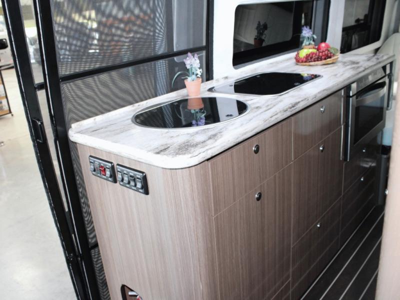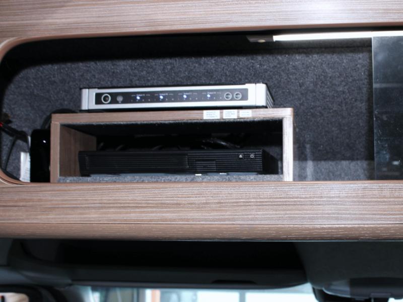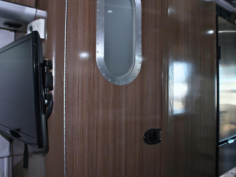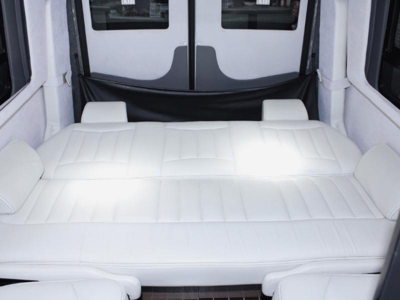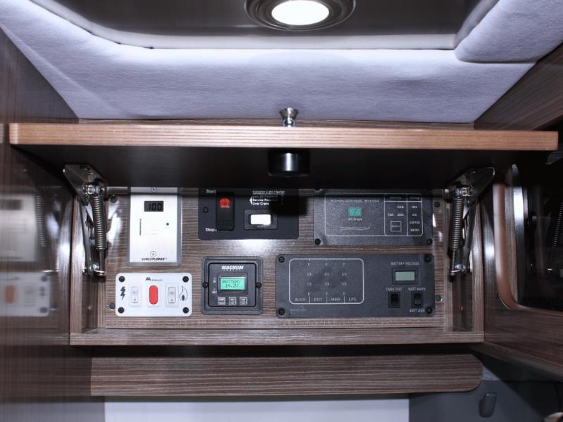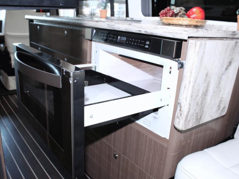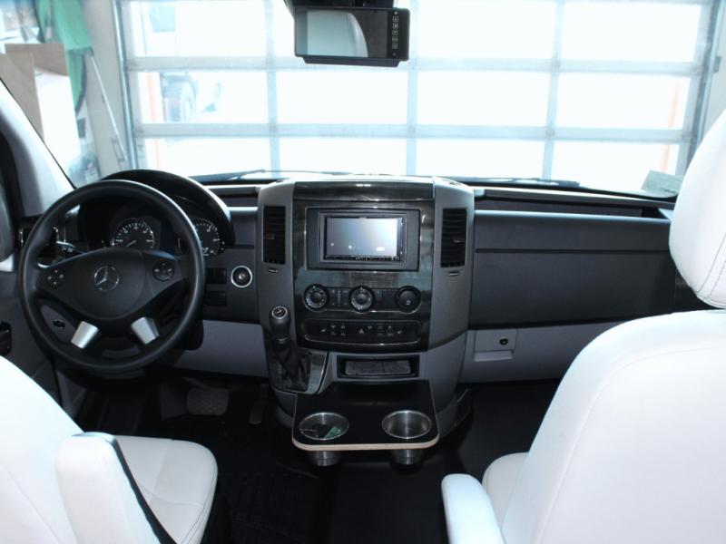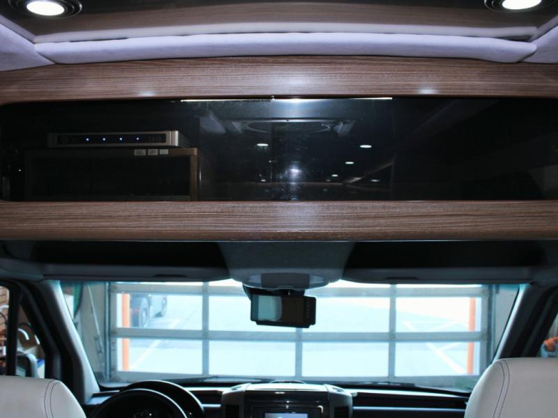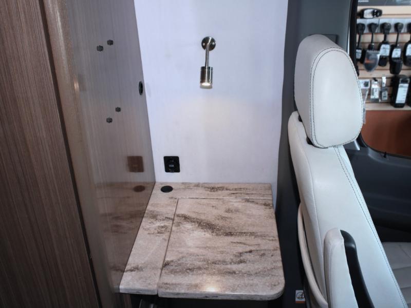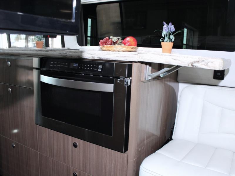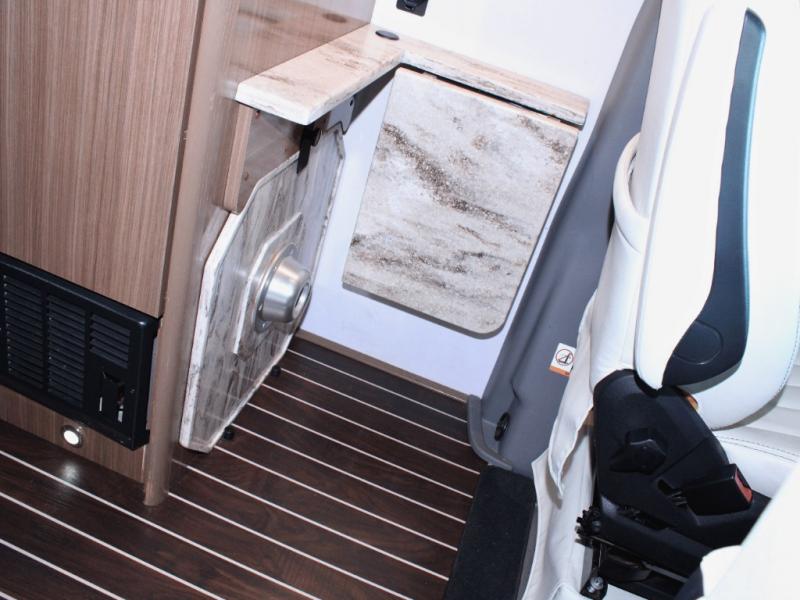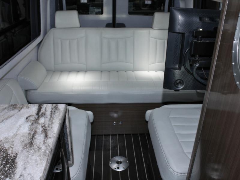 Step inside and find a convenient conversation area with the driver and passenger seats swiveled around. There is a removable table between the driver and passenger seat which allows for ease while eating or easy ability to play a game. Behind the driver's seat there is a work station and a LED TV.