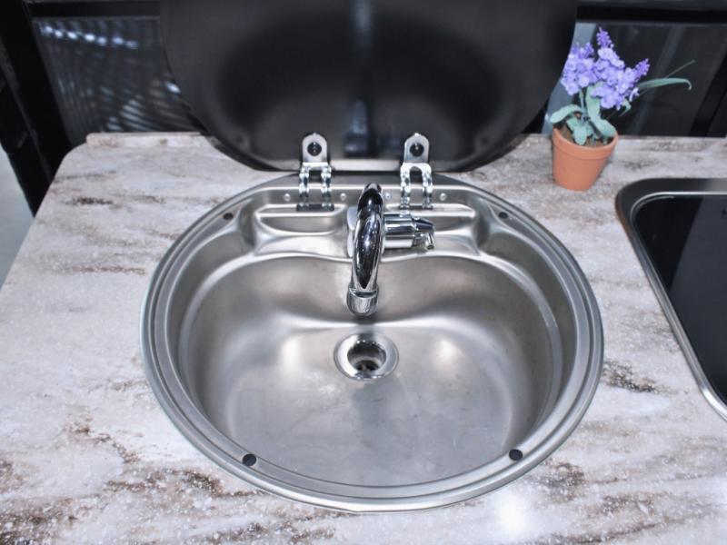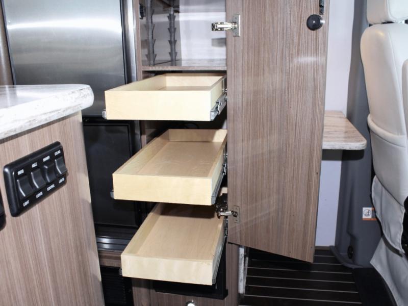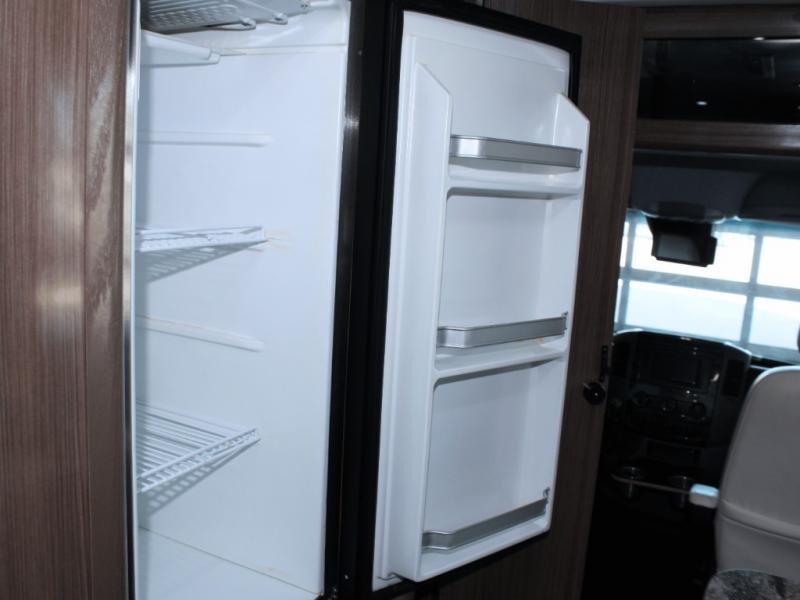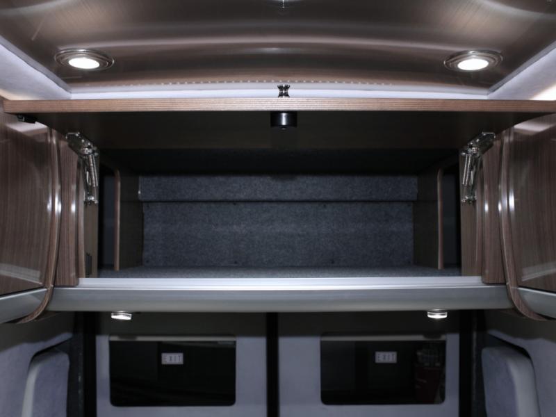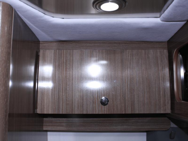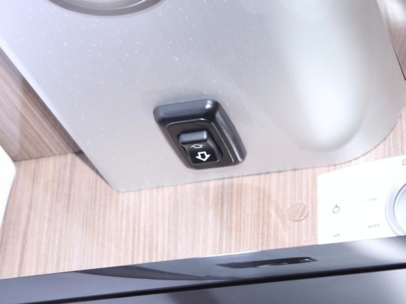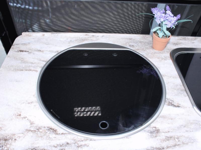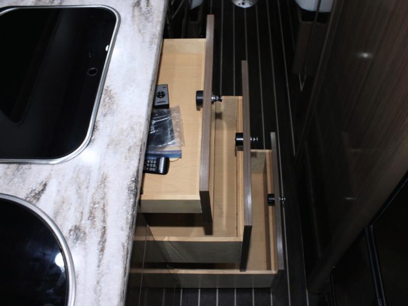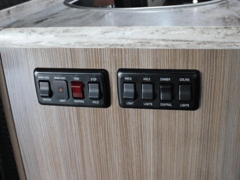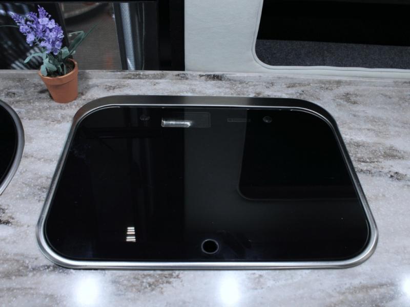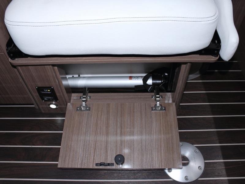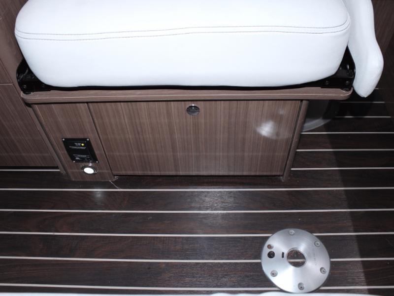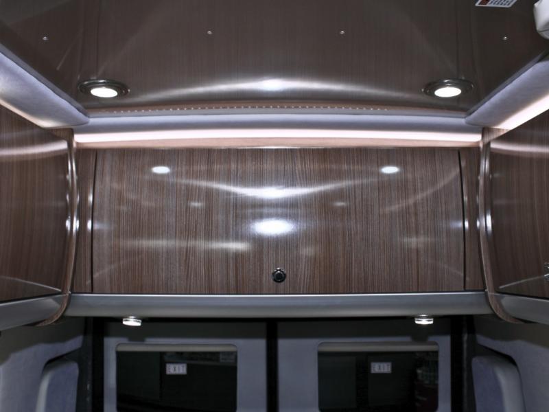 Step inside and find a convenient conversation area with the driver and passenger seats swiveled around. There is a removable table between the driver and passenger seat which allows for ease while eating or easy ability to play a game. Behind the driver's seat there is a work station and a LED TV.